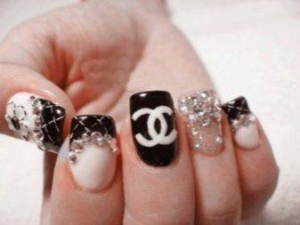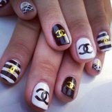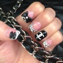 When performing a manicure in the style of Chanel uses basic shades - black, pink, silver or gold, white. The most common use of Chanel brand logo or geometric shapes used by this brand.