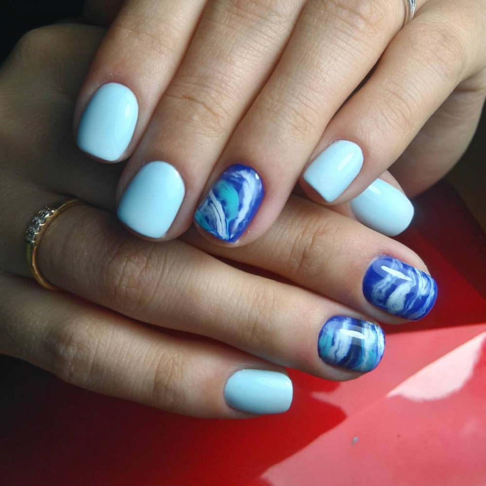 Despite the fact that the blue and blue manicure, as well as the design of the nails in blue and blue colors themselves are quite interesting and unusual options, this palette can be combined with other colors. As mentioned above, white can be an excellent shading color. And you can also use yellow. Pink will go well with blue, and red with blue.
