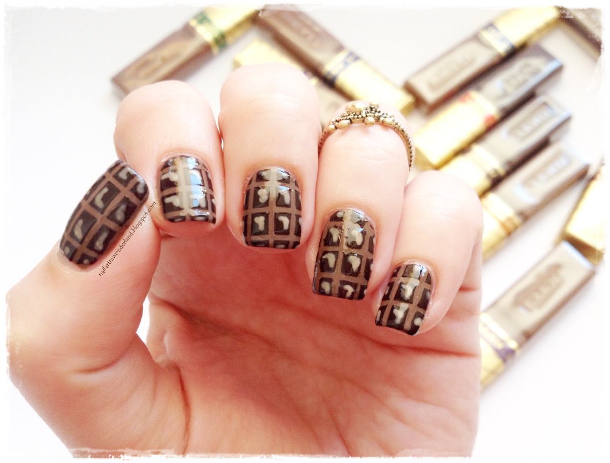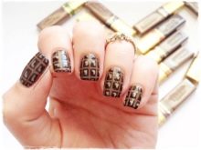 As with the waffle cone, chocolate manicure can be made in the form of a painted or sculpted chocolate bar. And the glued silver or gold foil will perfectly depict a chocolate wrapper.