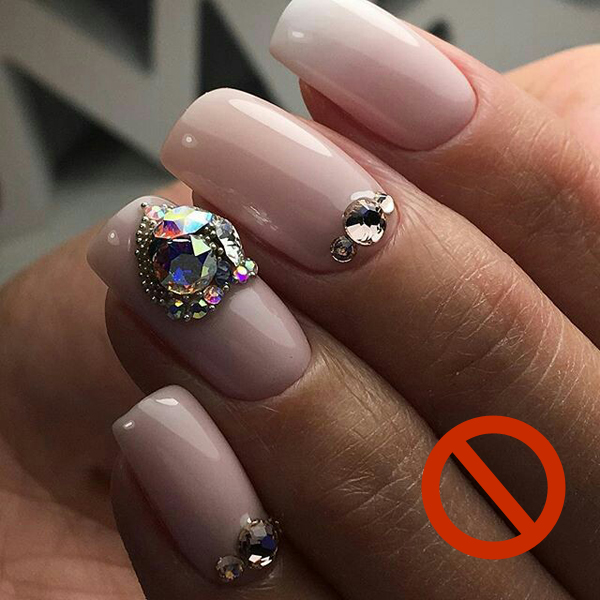 Also, do not glue one rhinestone in a classic manicure on the base of each nail, hoping that this will avoid the abundance of shine.