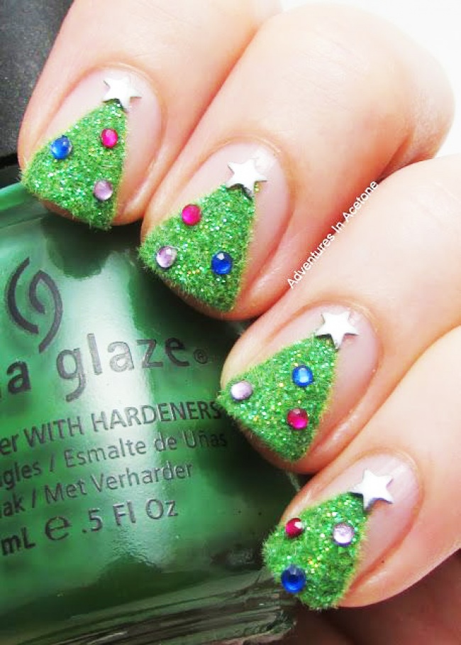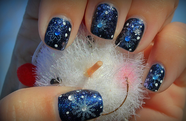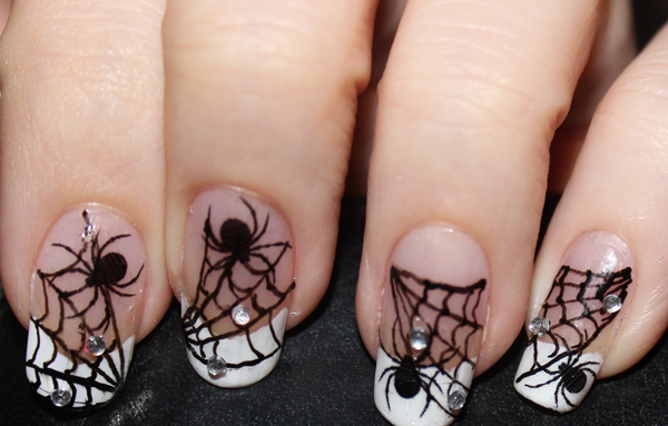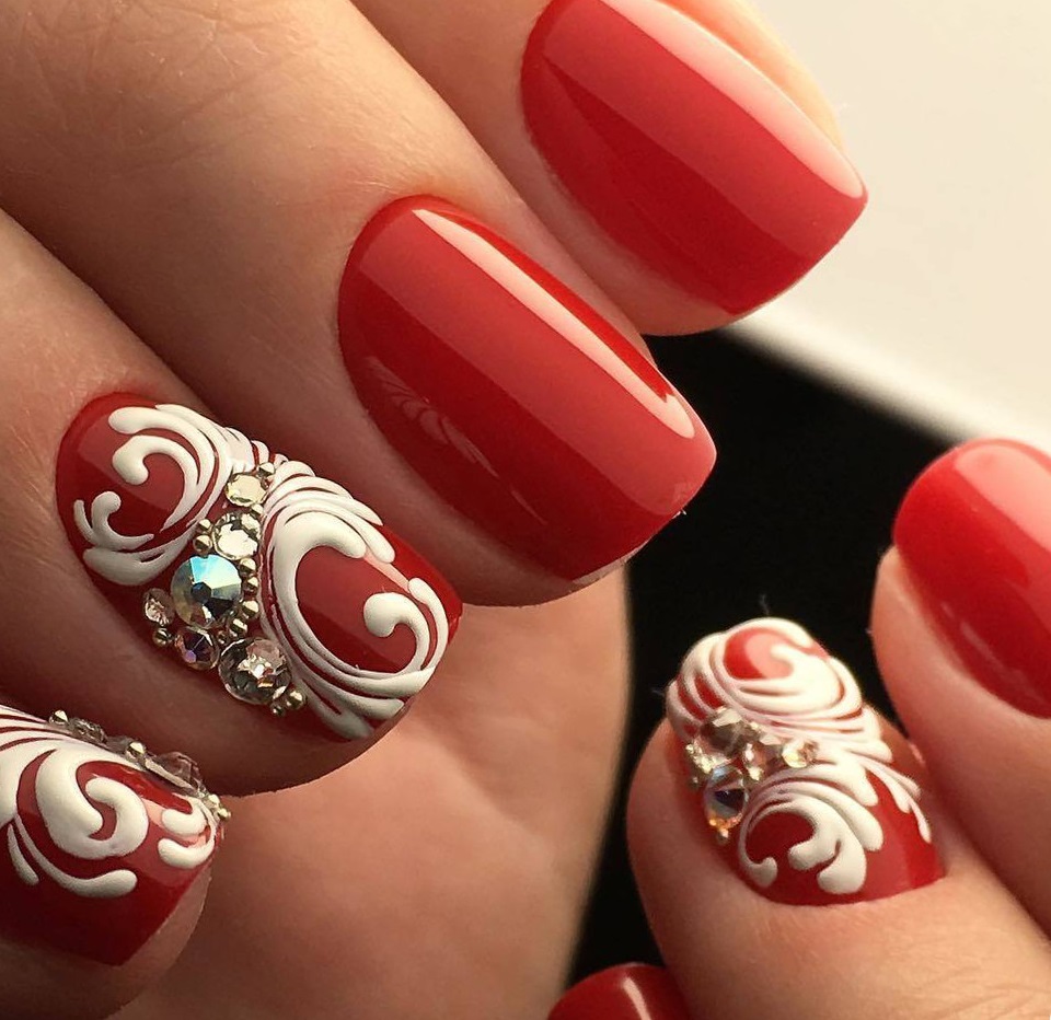 If a spider's web is chosen as a picture, then the rhinestones can be used to depict dew drops on it. It will look more harmonious if you choose transparent elements for decoration. Also, rhinestones can create a flickering effect by drawing fir branches, frost patterns. Similar decor looks beautiful when they are decorated with the center of snowflakes or imitate the leaves of plants when the print is very small. You can use colored rhinestones, depicting with their help flower buds.