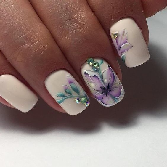 Beautifully looking decorative stones in the design with artistic painting. After drawing the picture, which should be simple and light on short nails, the elements are dotted on the drawing itself and the neighboring nail. In this case, the next plate should be decorated at the base with no more than 3-5 elements. It will be quite enough for expressive design.