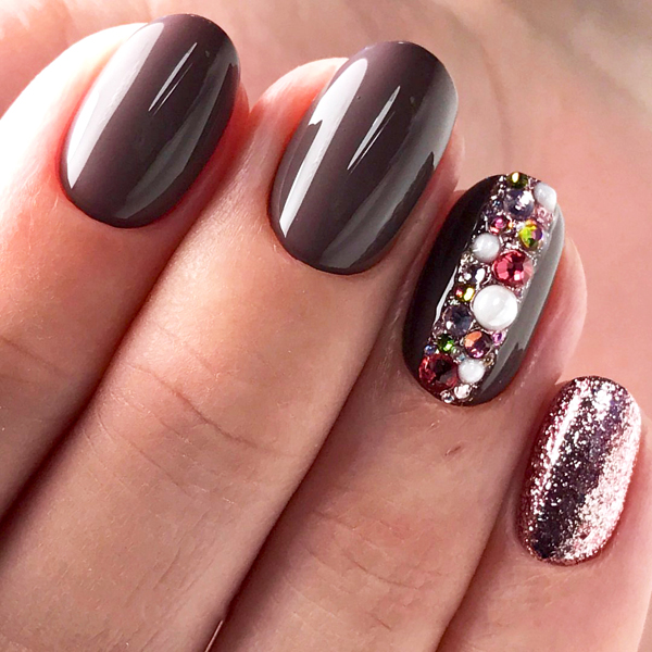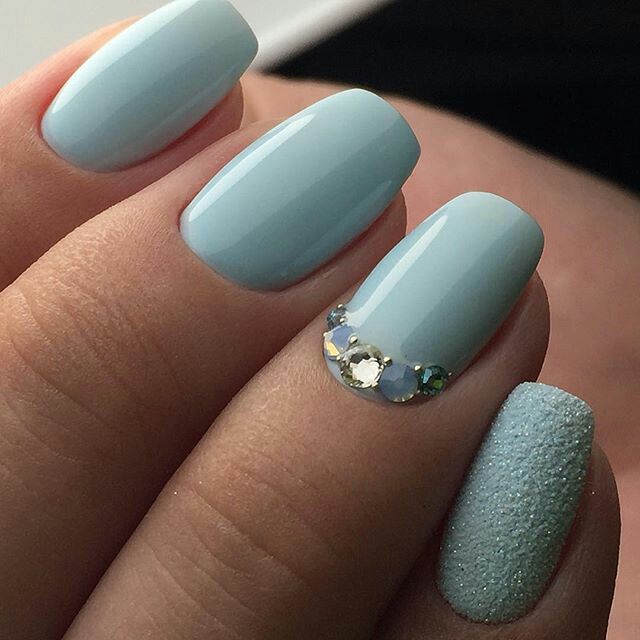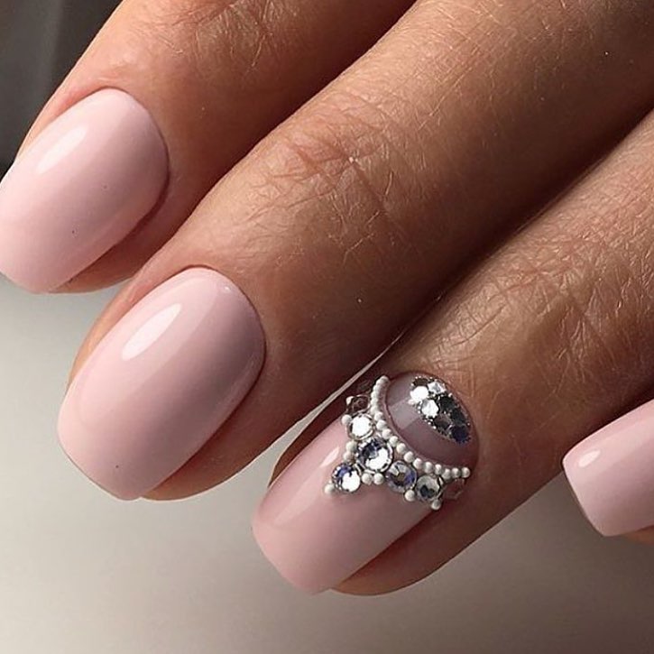 For harmony, they can be combined with glitter or broths. You can do this in different ways. For example, a rhinestone surrounded by bouillons, depicting with them the middle of a flower on an accent nail, will look more harmonious. You can use broths of different sizes, but crystals will be the main accent.