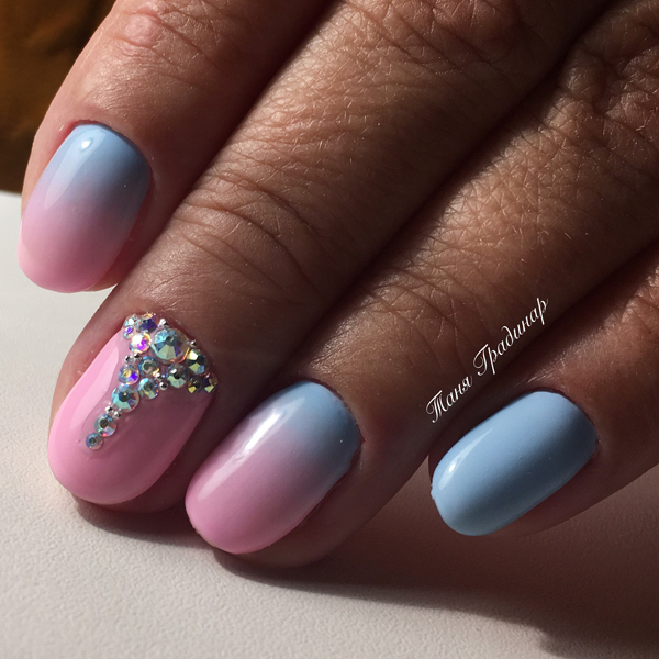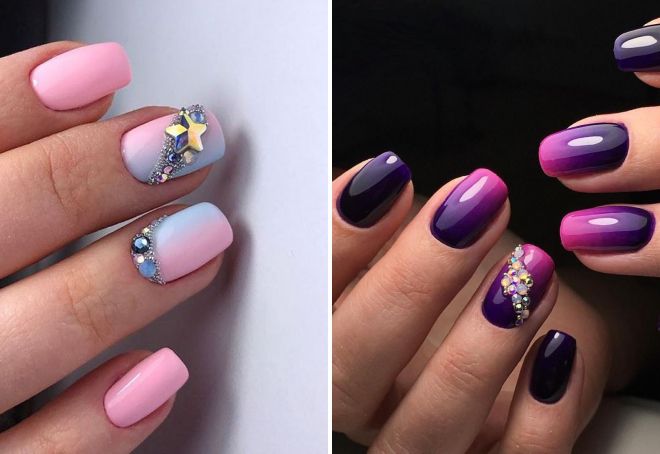 On the basis of the gradient, you can decorate two nails out of ten with a vertical of small rhinestones, selecting a sparkling decor of a transparent or colored type.