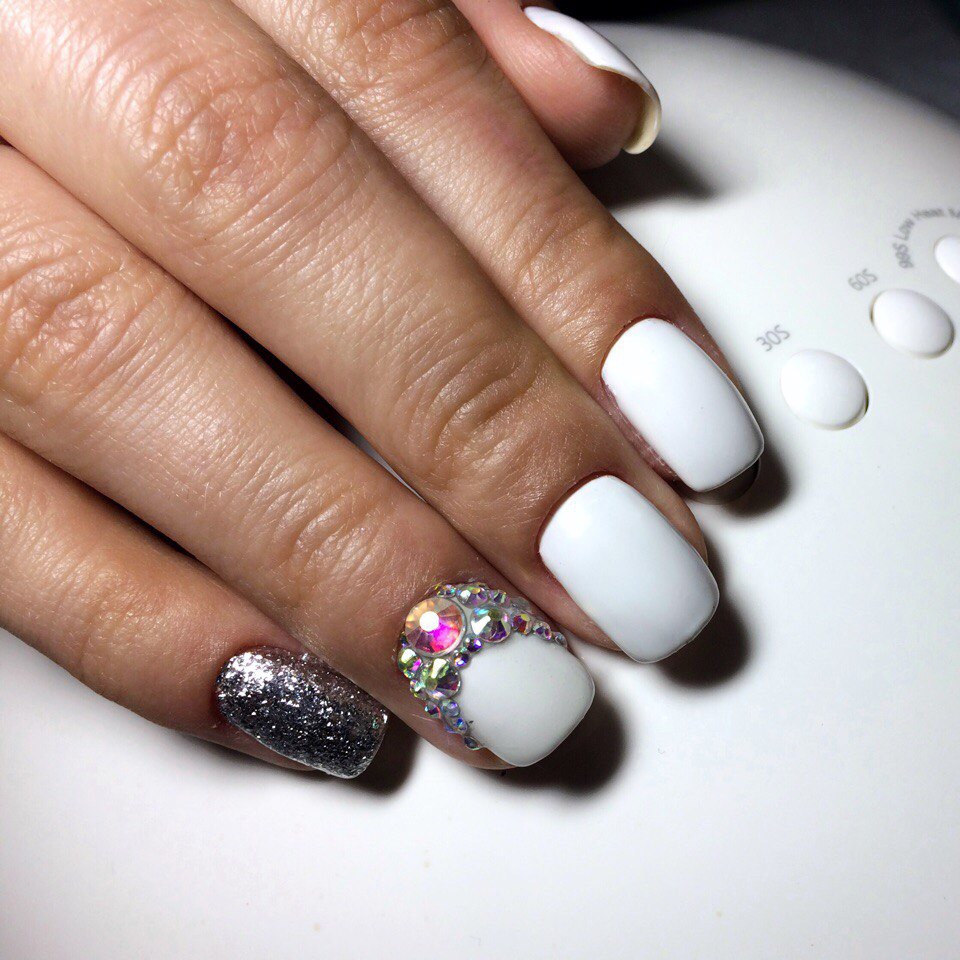 If the technique is based on art painting, you can use rhinestones to create volumetric centers. At the same time, you can choose a sparkling decor with a rainbow shine. When the area of the accent plate is enough, you can support the rhinestones with silver, tracing the arch in the cuticle area with silver glitter.