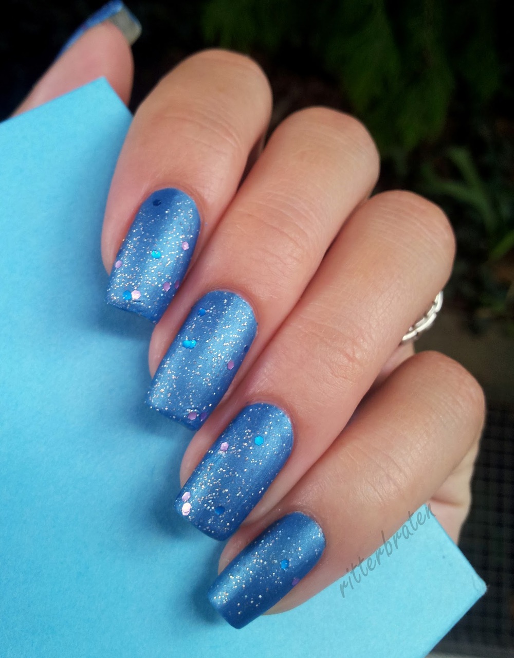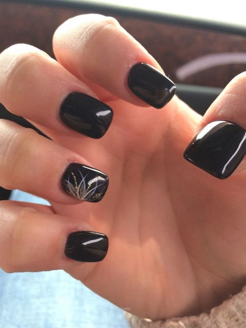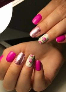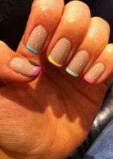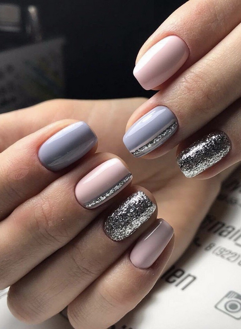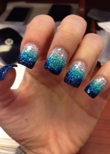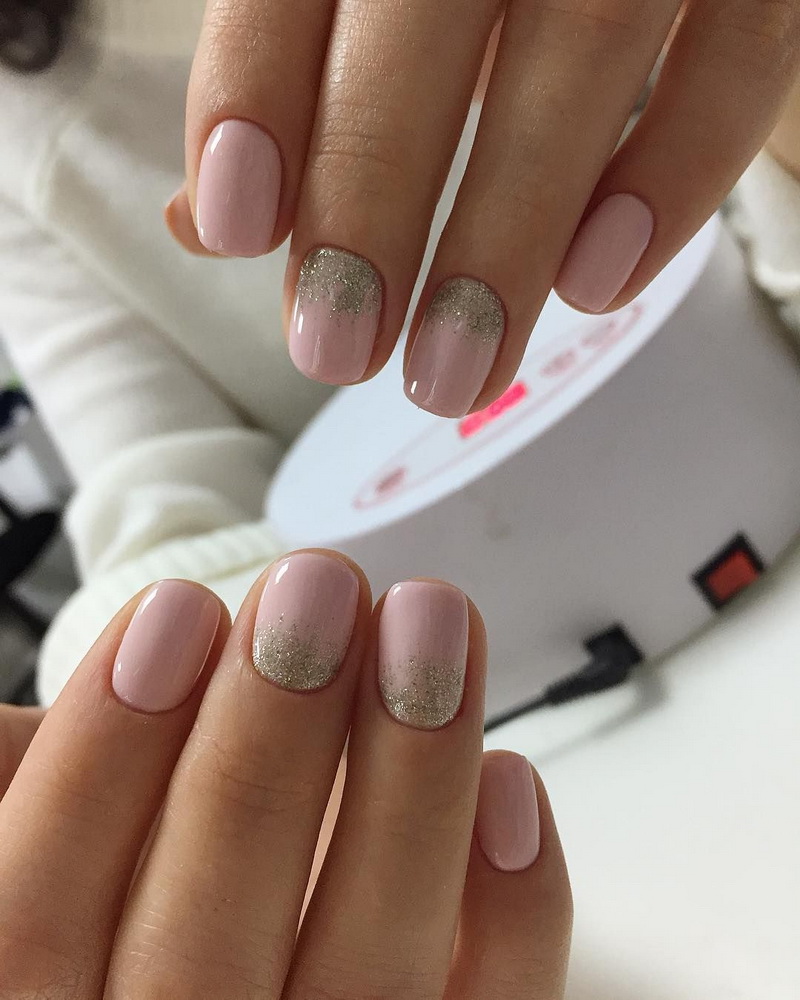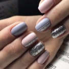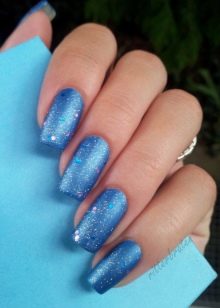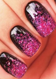 Glitter is small spangles that can be dry, crumbly or based on nail polish. It is worth noting that the dry version shines much better and allows you to create a volumetric shine. Glitter is not recommended to be applied on all plates, but only to dilute the main color with it on two or three nails. Manicure with sparkles is especially relevant for holidays, evening events.