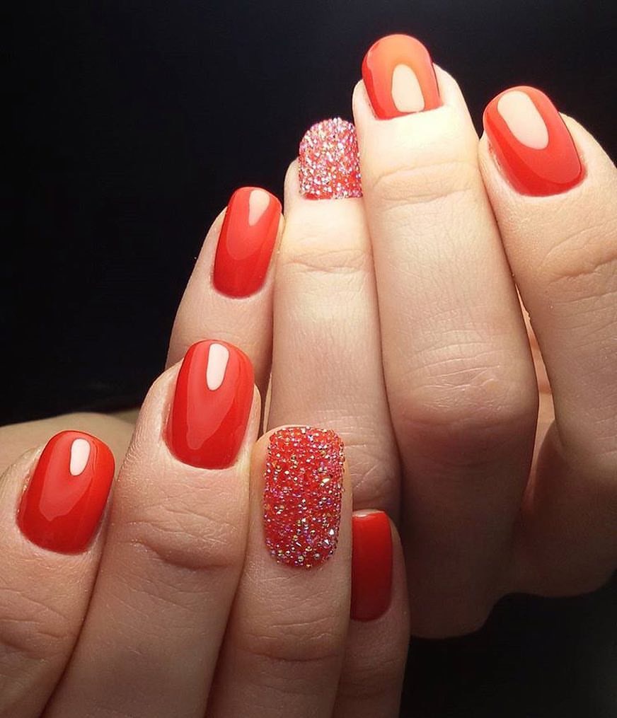 - Red. It seems that this version of the manicure will always remain relevant. If the plain version seems too boring to you, then no one forbids diluting it with drawings and sparkles. Make sure that he does not look too pretentious. This can be achieved with the help of muted shades and a restrained amount of decor and patterns. To accent it will be enough to decorate only one finger, and not to pile up rhinestones, sparkles and stones on each of them.