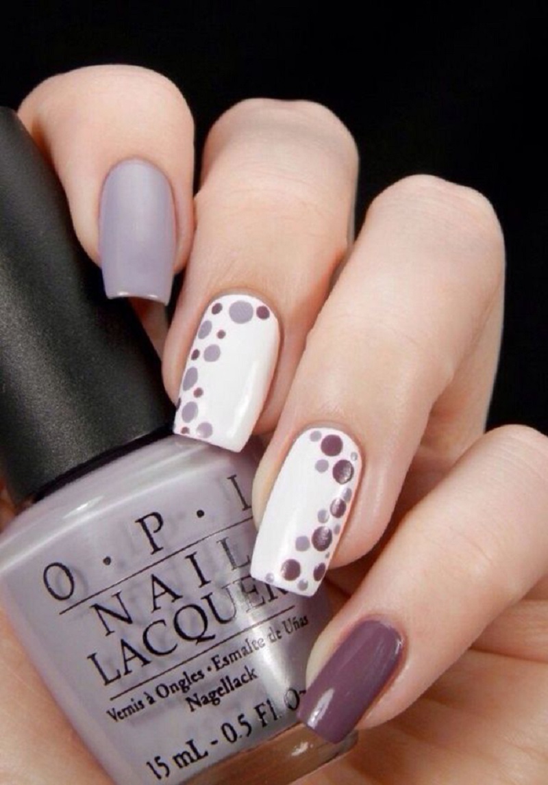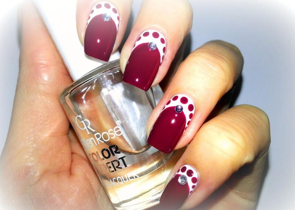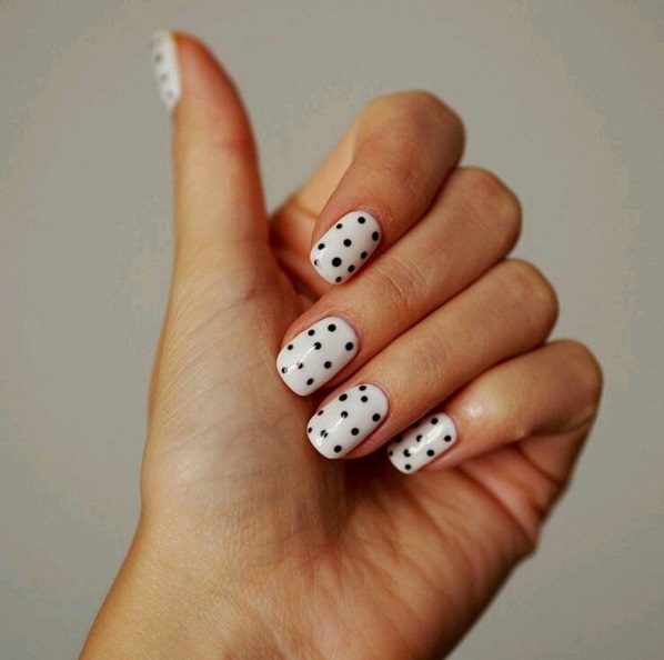 Short nails are well decorated with small white dots. Place them preferably on a dark surface. White dots look great on a burgundy, cherry or black background. Symmetric circles of large and small size in a random or staggered order are ideal for rectangular nails. You can decorate only two nails. Gradient manicure with traced peas, increasing in size from the hole to the edge of the nail, looks great on short nails.