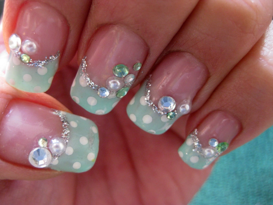 White and green manicure always attracts the attention of others. The dark green coating goes well with the white pattern and peas. Large rhinestones will give your nails a special piquancy. Coating nails with turquoise gel is always in trend, regardless of the season. Vividness and enthusiasm give such a manicure peas and bows.