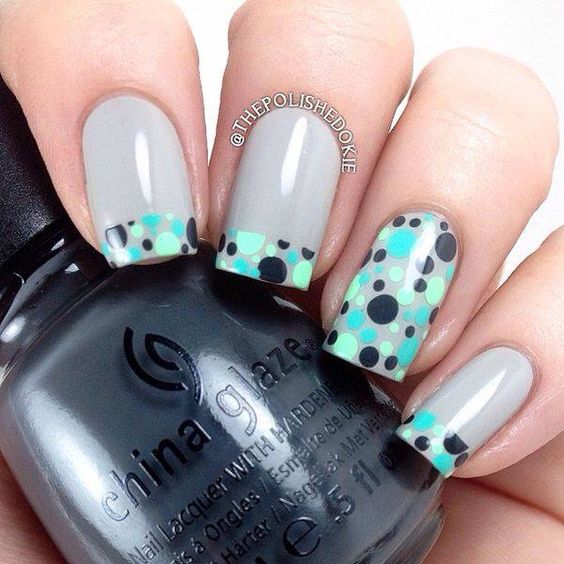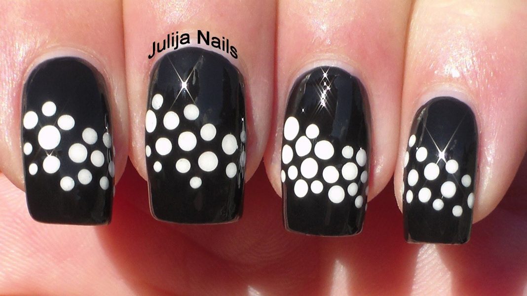 Peculiar gradient polka dot manicure. Often the diameter of the circle is reduced in the direction to the edge of the nail.