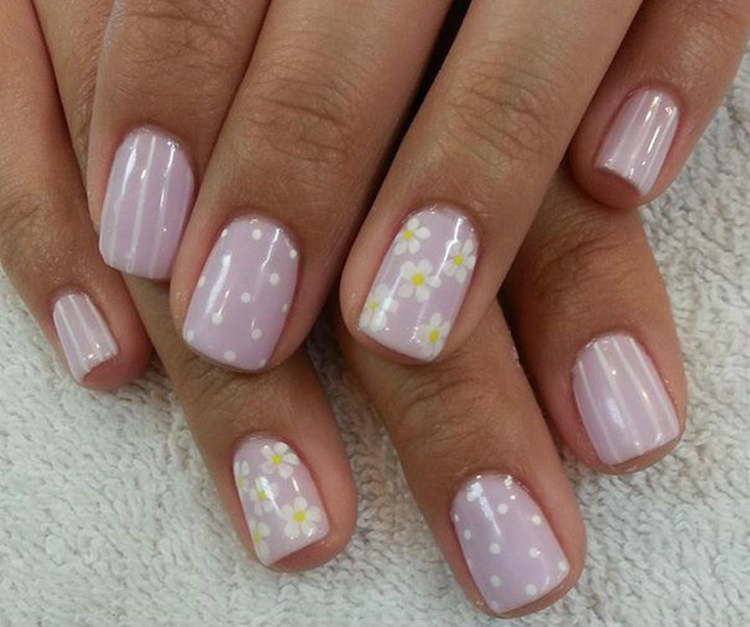 On tanned girlish fingers, the lilac color of light shades looks beautiful. Two or three nails are decorated with small white peas, others - with daisies with light yellow centers. This design gives the girl affection and naivety.