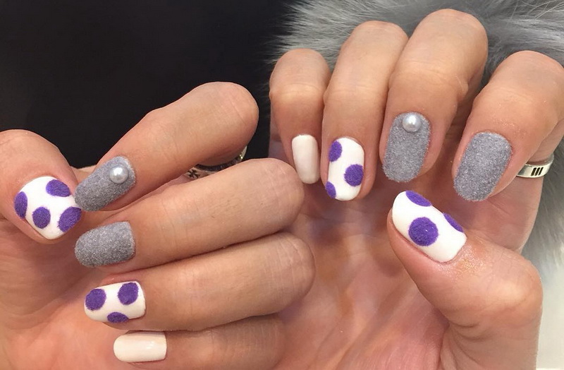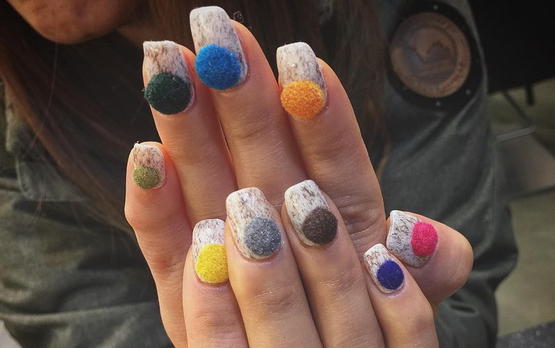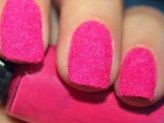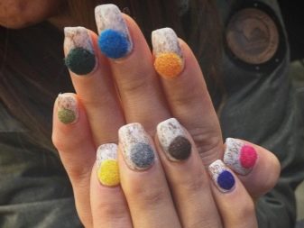 - Fleecy soft flock will help make beautiful velvet nails. Funny wool manicure is obtained using velvet powder. Feathers, tassels, tails, all kinds of pompons can be the embodiment of original ideas of manicure masters. At home, first paint the nail color varnish, then sprinkle it with fur. Surplus gently sweep brush.