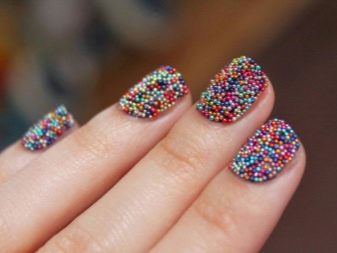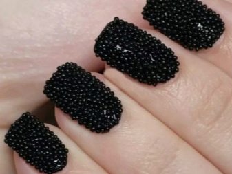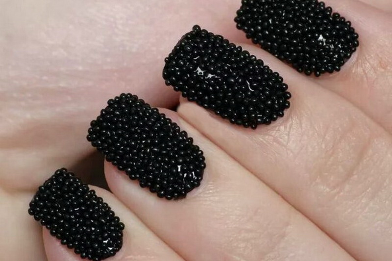 - Continuous application of granules creates caviar manicure. Nails, completely studded with beads, look stylish and luxurious.