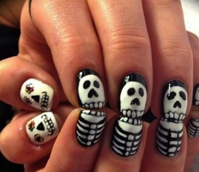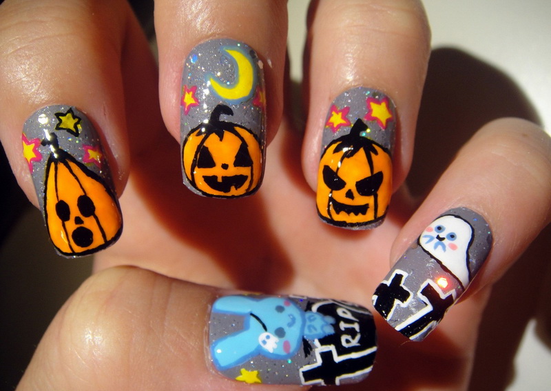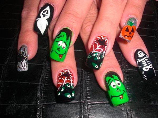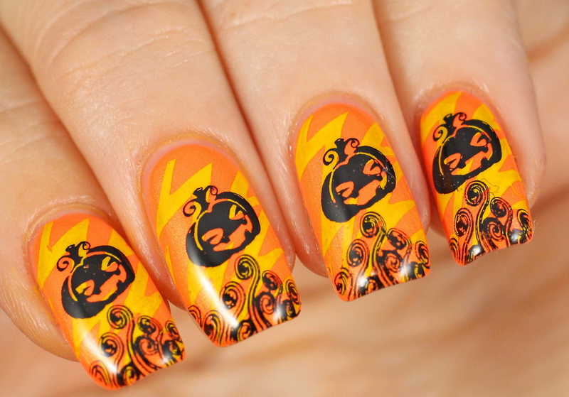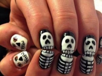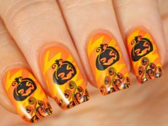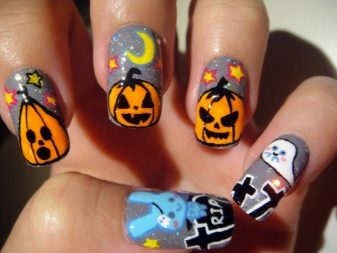 In recent years, English language learners are celebrating Halloweenoriginated in ancient Ireland and Scotland. The participants of the event dressed in carnival costumes place his symbols on his nails: smiling pumpkins, various ghosts, mummies and Frankinstein monsters. Traditionally, for holiday manicure use orange and black.
