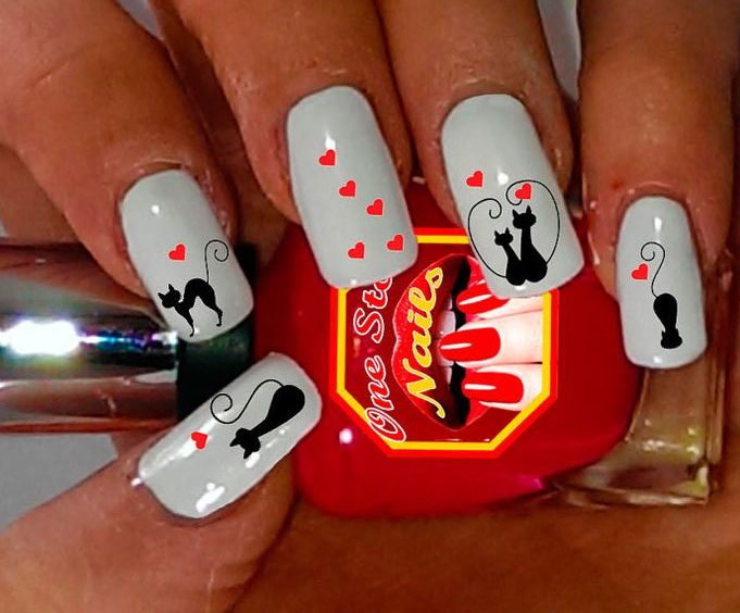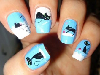 - Young ladies like to put cats on their nails. Gentle and graceful women sometimes remind themselves of fluffy and beautiful pets. On the New Year's manicure the cat can be drawn in the costume of Santa Claus. Sometimes a funny cat's face is drawn on each nail, carefully tracing the contour of the head with a black tone, pupils shading the ears. At the final stage, a huge white mustache is outlined. You can find the most diverse manicure on cat themes. Sometimes cats are portrayed with a curved back. Over the years, it is fashionable to apply lines to the nails that mimic a flat cat's pupil. The eye of the animal on the nails attracts the eyes of others with its incredible brilliance.