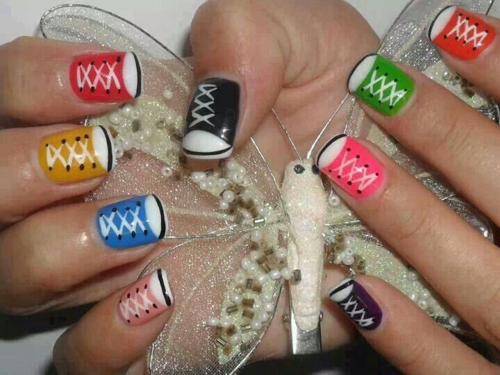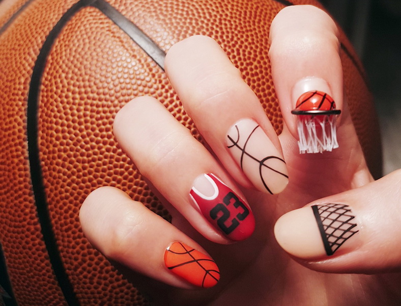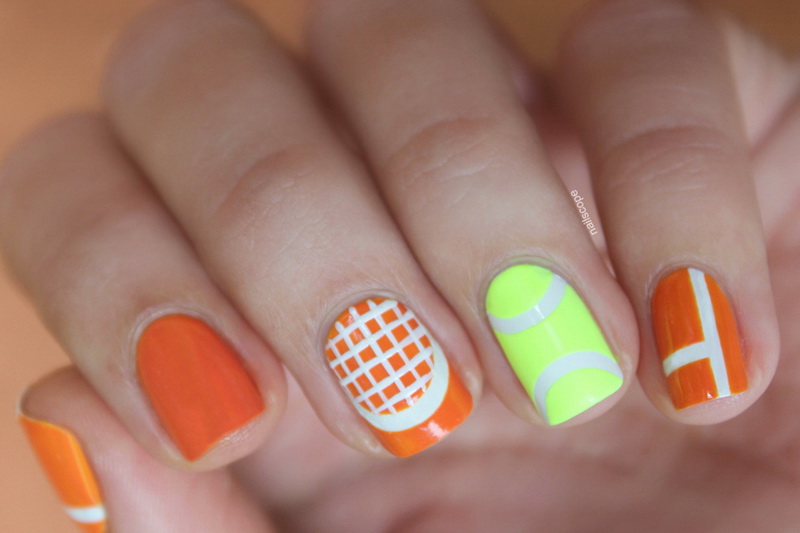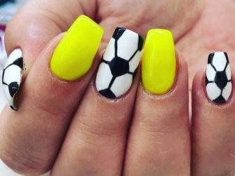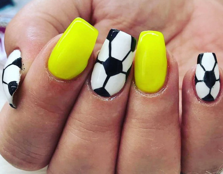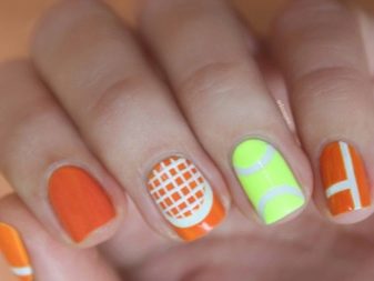 - Sporty design prefer relaxed dynamic girls in the appropriate equipment. Colorful sneakers, sneakers, soccer ball, tennis print look funny on the nails.