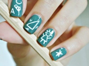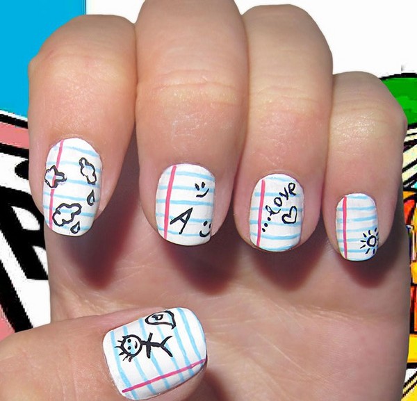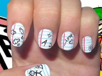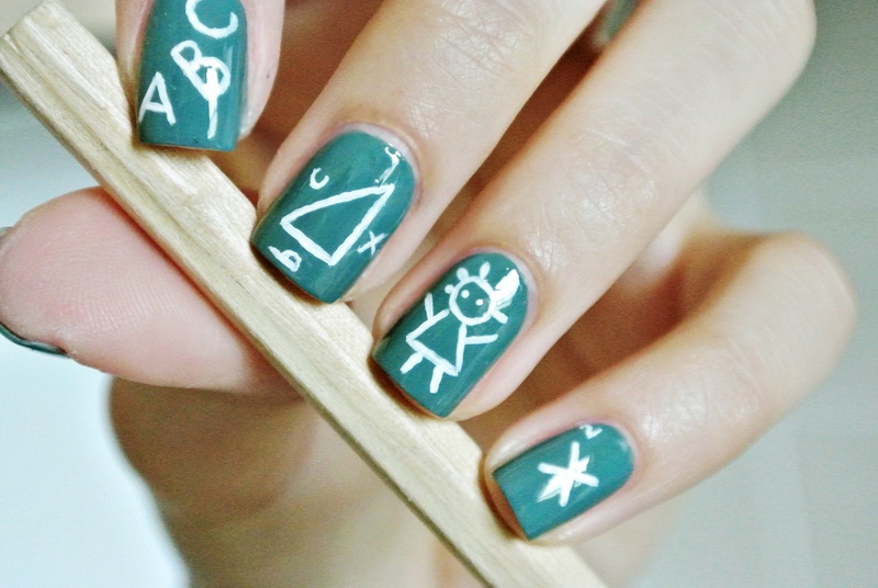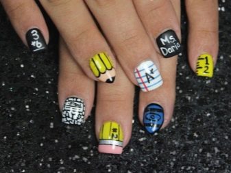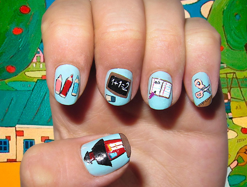 - High school students sometimes depict objects related to school subjects on their nails: globes, textbooks, notebooks, pencils, formulas, numbers, letters.