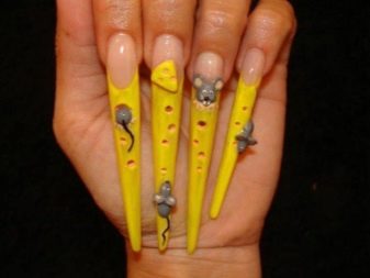 - With the help of a gel or acrylic, the girls manage to turn their nails into flippers, pieces of cheese. It has become fashionable to depict mice next to cheese. The naughty mice gnawing cheese look on nails very originally and amusingly.