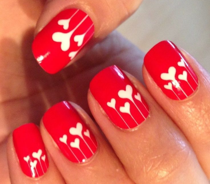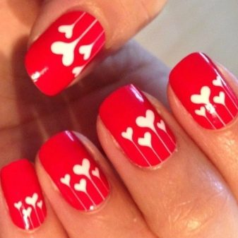 It has become a tradition to celebrate Valentine's Day on February 14th. Young people love this western holiday. On Valentine's Day, it is customary to exchange gifts, give sweets and cards to your loved ones. Girls in love try to draw hearts on their nails for this day. Often depict a kiss as a trace of make-up lips.Sometimes they write on the nail plate the word "love" in Russian or English.