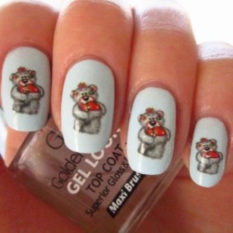 - The placement on the nail surface of various funny animals has become widespread. Hares, bears, birds emphasize the immediacy and playfulness of young persons. In specialized stores you can buy sliders with pictures of funny animals for every taste.