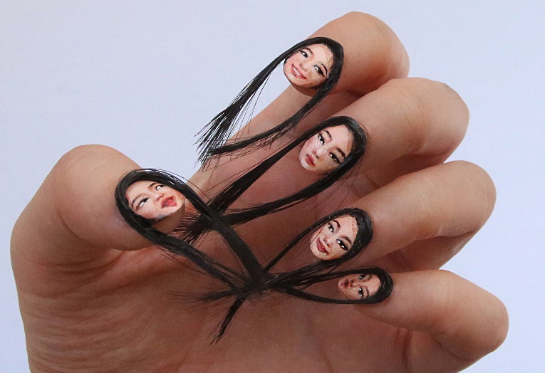 Banknotes, newspaper text, characters, notes, dice, Lego, Ninja turtles, even the faces of famous people can be unexpectedly seen on the girl's nails.