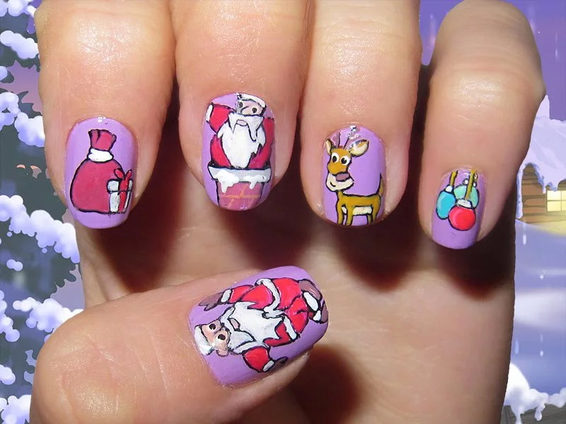 New Year's nail design involves the image of the original frosty patterns, fir branches, bright birds, owls, deer, bears. The holiday does not do without Santa Claus and the Snow Maiden, who often turn into funny funny characters on the nail surface. Thanks to the image of colorful Christmas tree decorations, a cheerful and elegant manicure is obtained.