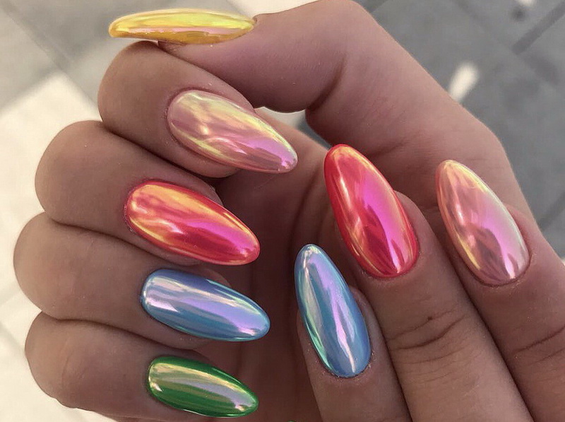 - "Unicorn". In appearance, it looks like a pearl, but the color is more saturated and warm. Widespread azure, pink, blue shades, the color of pure water."Unicorn" (sometimes called "Mermaid" or "Aurora") has a glossy surface that reflects light. Bright decorations are superfluous in such a manicure, but with matte coatings, this kind of rubbing is perfectly combined.