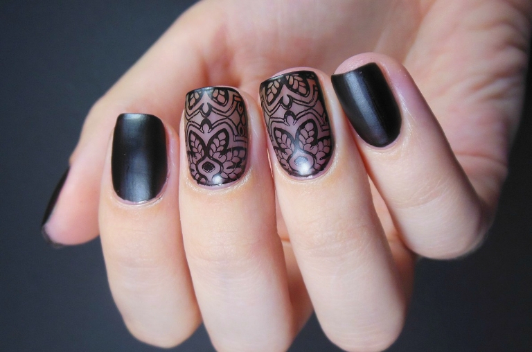 If you do not want to mess around with stickers, you can replace the tedious drawing with a cunning invention - stemping. These are ready-made patterns with a variety of engraved patterns. Patterns from them are transferred by means of a special roller, which makes it possible to make an image on a translucent coating in a matter of seconds. In this case, the lines of such drawings are always smooth and clean, due to which the manicure looks professional.