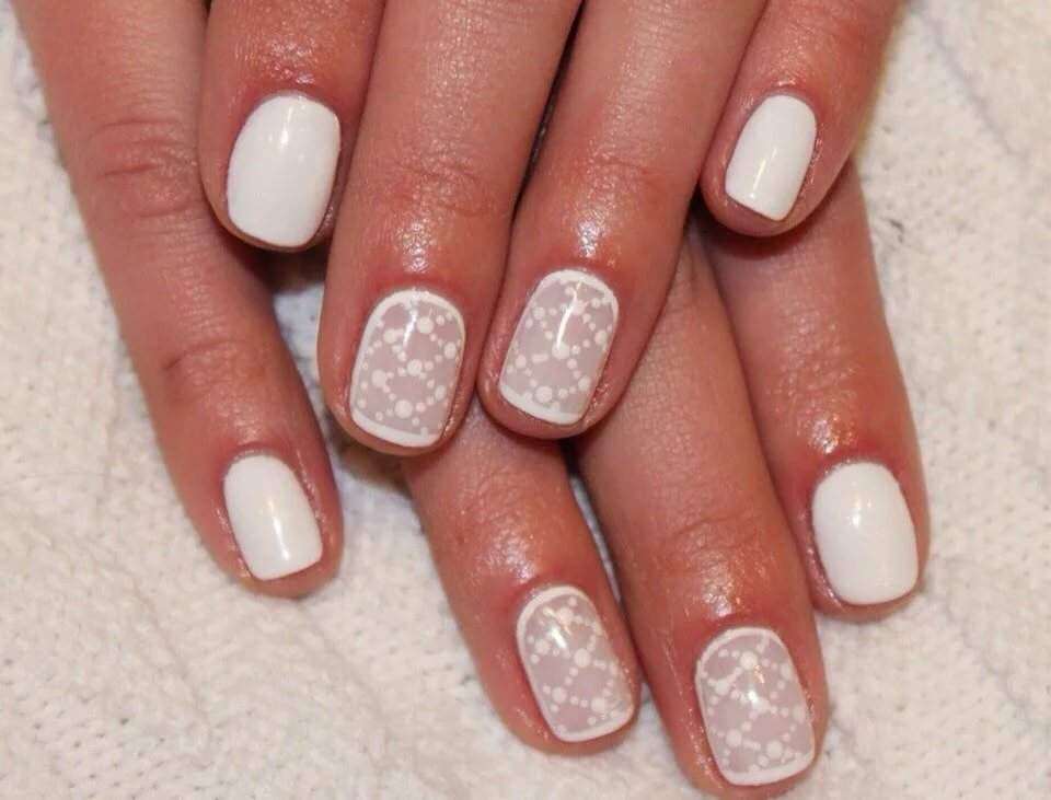 Make out the nails in the nylon technology can be different. For example, it could be the design of the entire nail plate, a vertical inset on a contrasting background, a part of the nail separated by a diagonal or even a wide “smile” of a French jacket. As for the implementation of the design in white color, then here it will be better to look at the nail design over the entire area. To make the manicure look impressive, you should choose no more than four nails for “capron”, and paint the rest with white lacquer, and cover it with a velvety top.