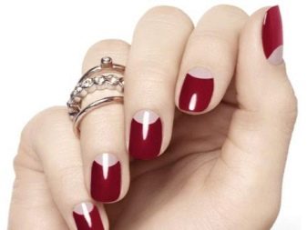 This trend of recent years is nothing more than the opposite version of the jacket. Visually, he lengthens the plate by making the hole in a semicircle or acute angle. It can be painted both with a transparent varnish, and brilliant, light or contrast. A sharp transition between the hole and the main background makes the surface of the nail visually longer. You can perform it in bright colors and in neutral.
