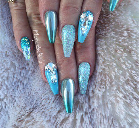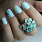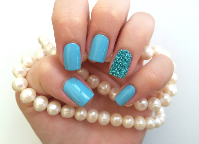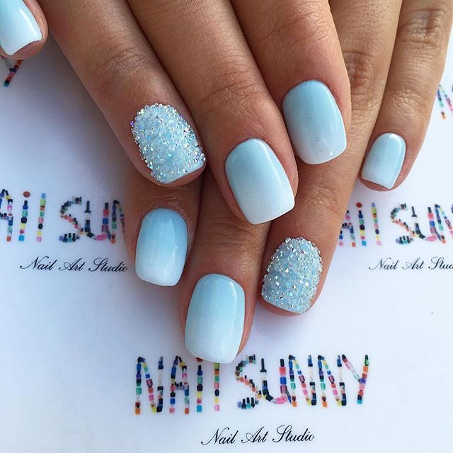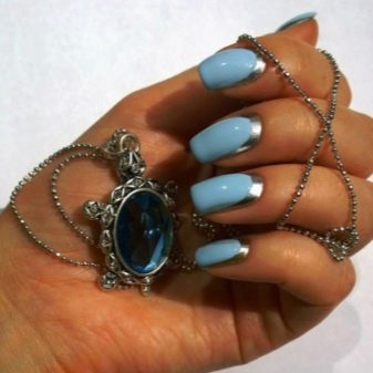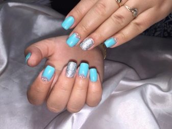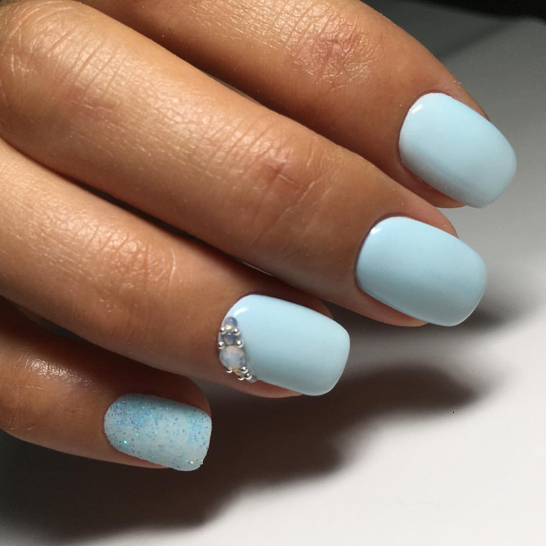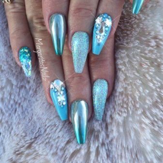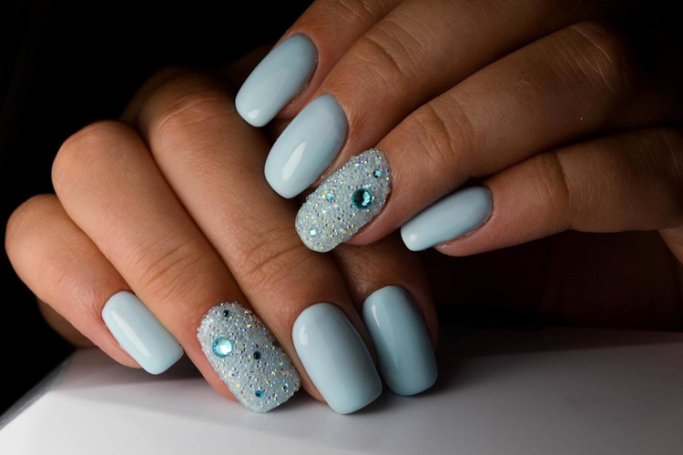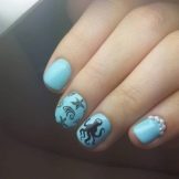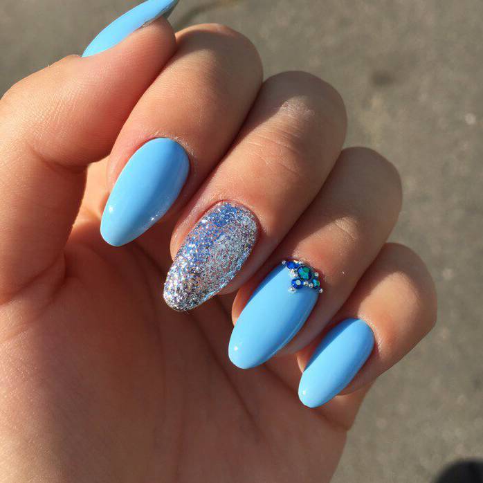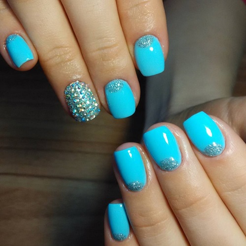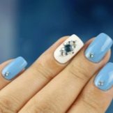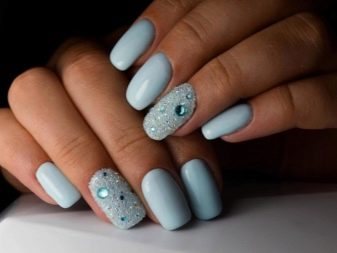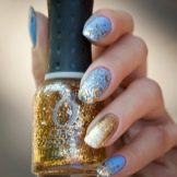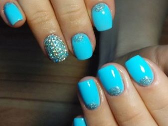 Choosing sparkles as a basis for decoration, you need to understand: without its dosage, this decor can disrupt the harmony of the design of nails in blue tones. The abundance of gloss today is irrelevant, and besides, the nail plates completely covered with it can cause a loss of expressiveness of accent nails. However, drawing the same gold or silver would be quite appropriate. It is better to add rhinestones elegance manicure and help to place accents on the nails. In addition, the sparkles are voluminous, unlike rhinestones and crystals.