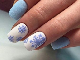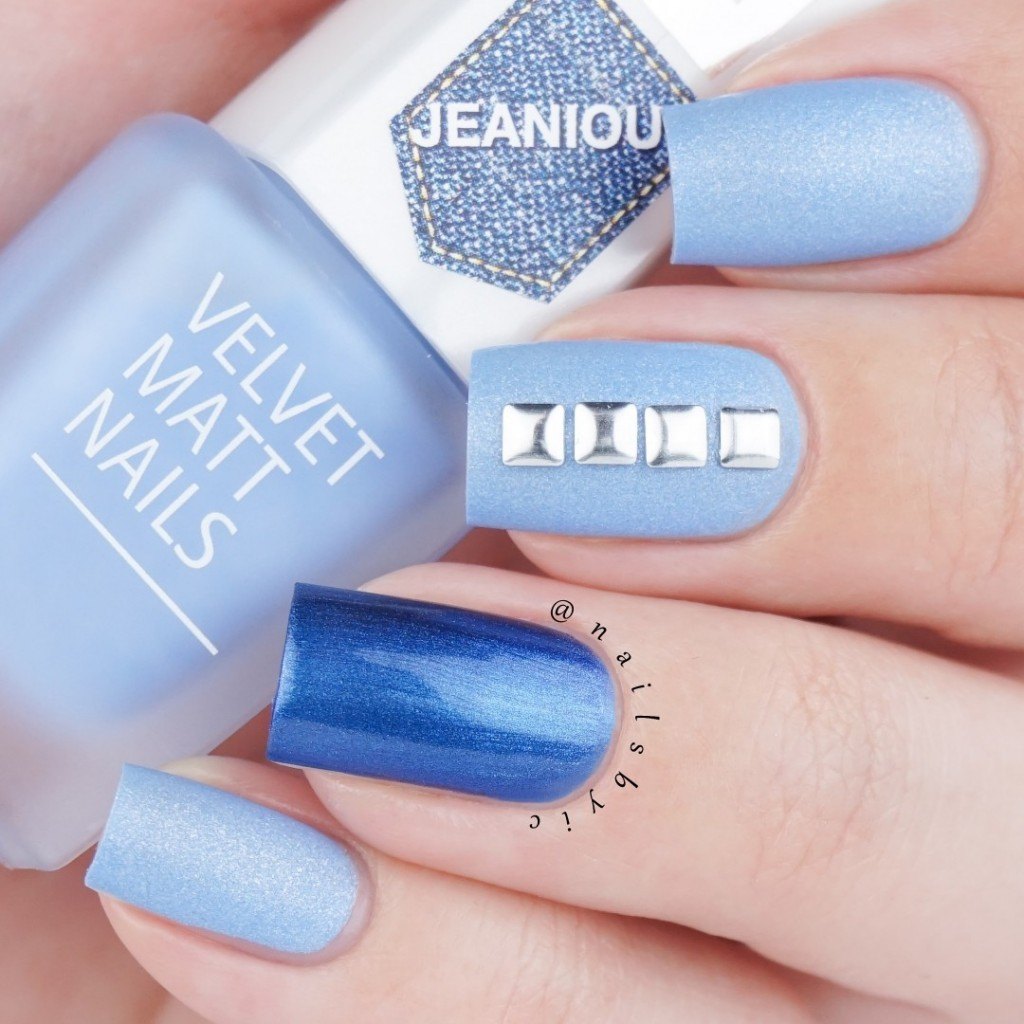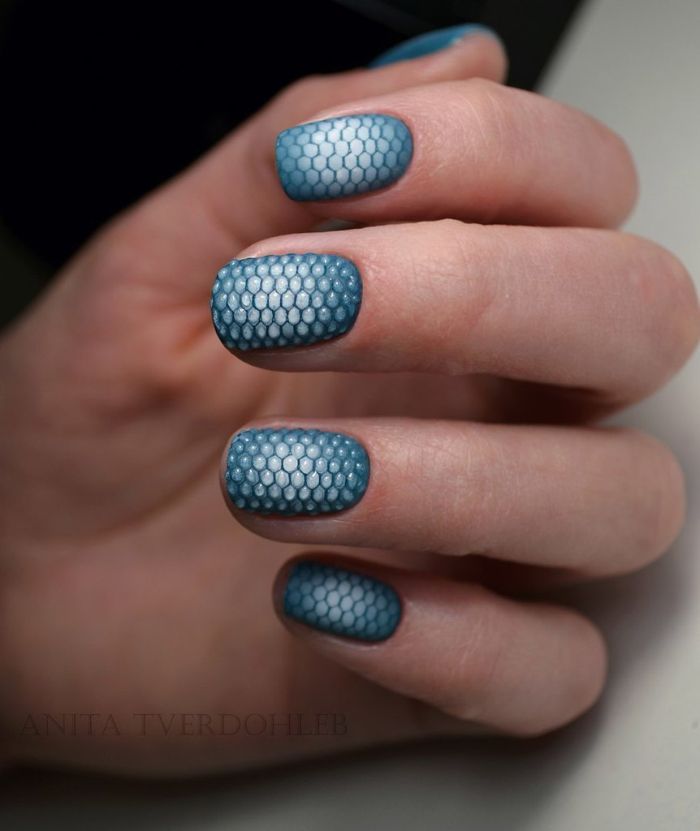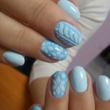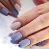 This innovation allows for an interesting surface texture. It seems rough and voluminous, performed using flock powder, which can be purchased at a specialty store. The range of such products is quite wide, which allows you to create a design not only in a single blue color. If desired, the pattern on the accent nails of the hands can be contrasted. With the help of acrylic powder, you can create the effect of a knitted pattern - fashionable design this season.