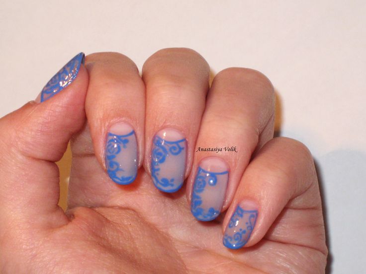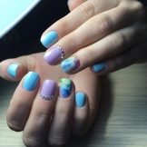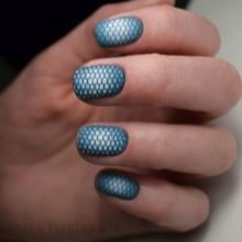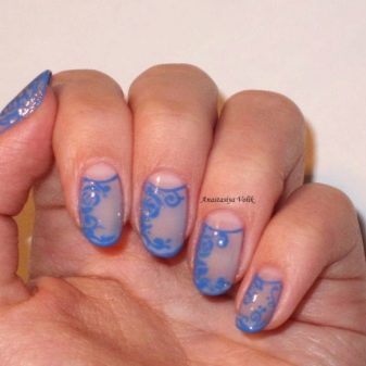 Blue veil manicure is one of the trends of this season. Achieve the effect of nylon pantyhose as follows: the pigment is diluted with a clear varnish and paint the nail plate. Then they are decorated at their discretion and covered with a layer of the final product. This design looks incredibly stylish. At the same time, it may involve the use of not only blue, but also the inclusion of black in the minimum amount.