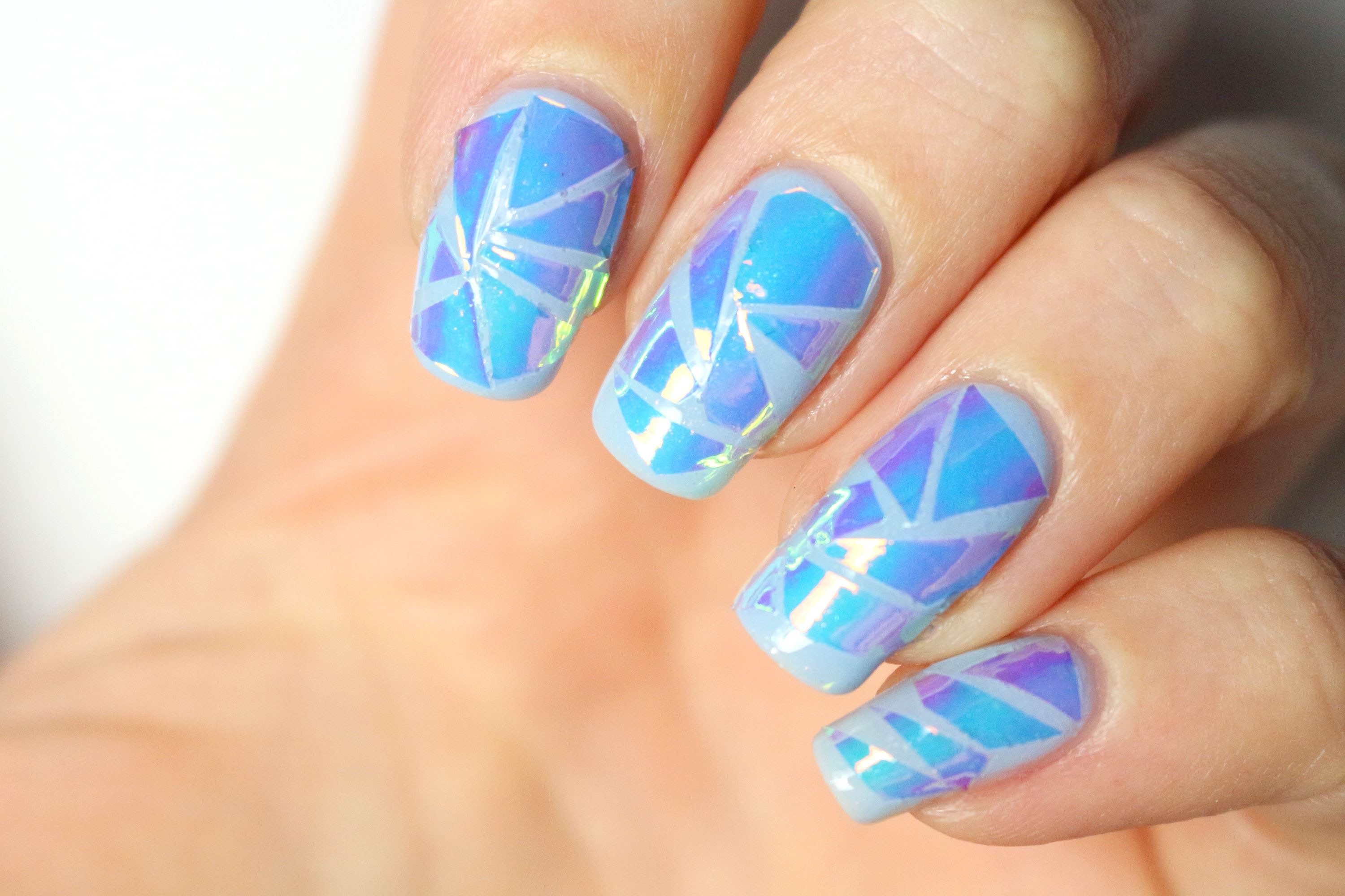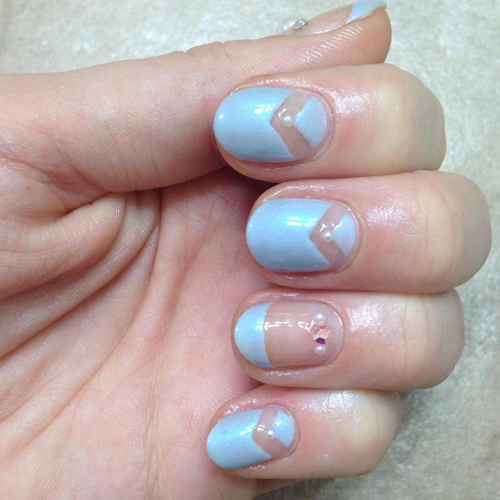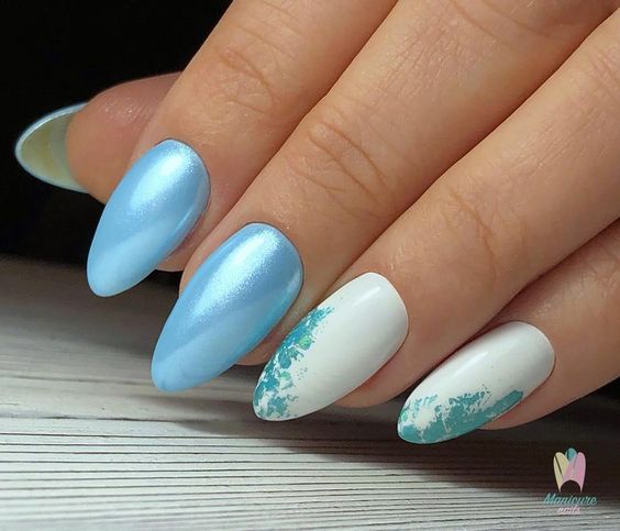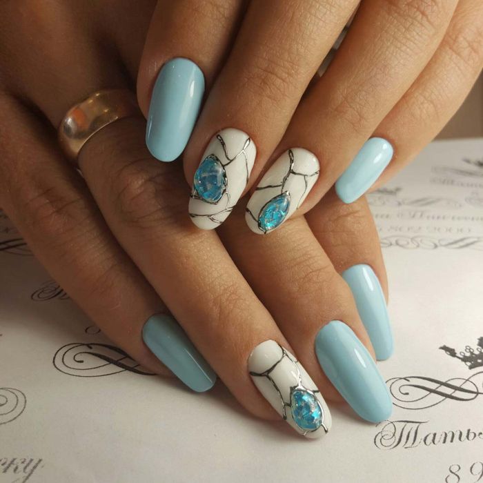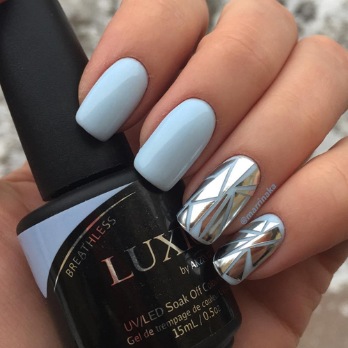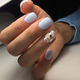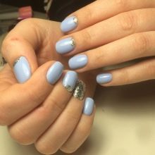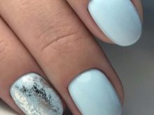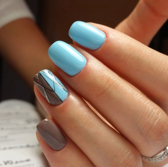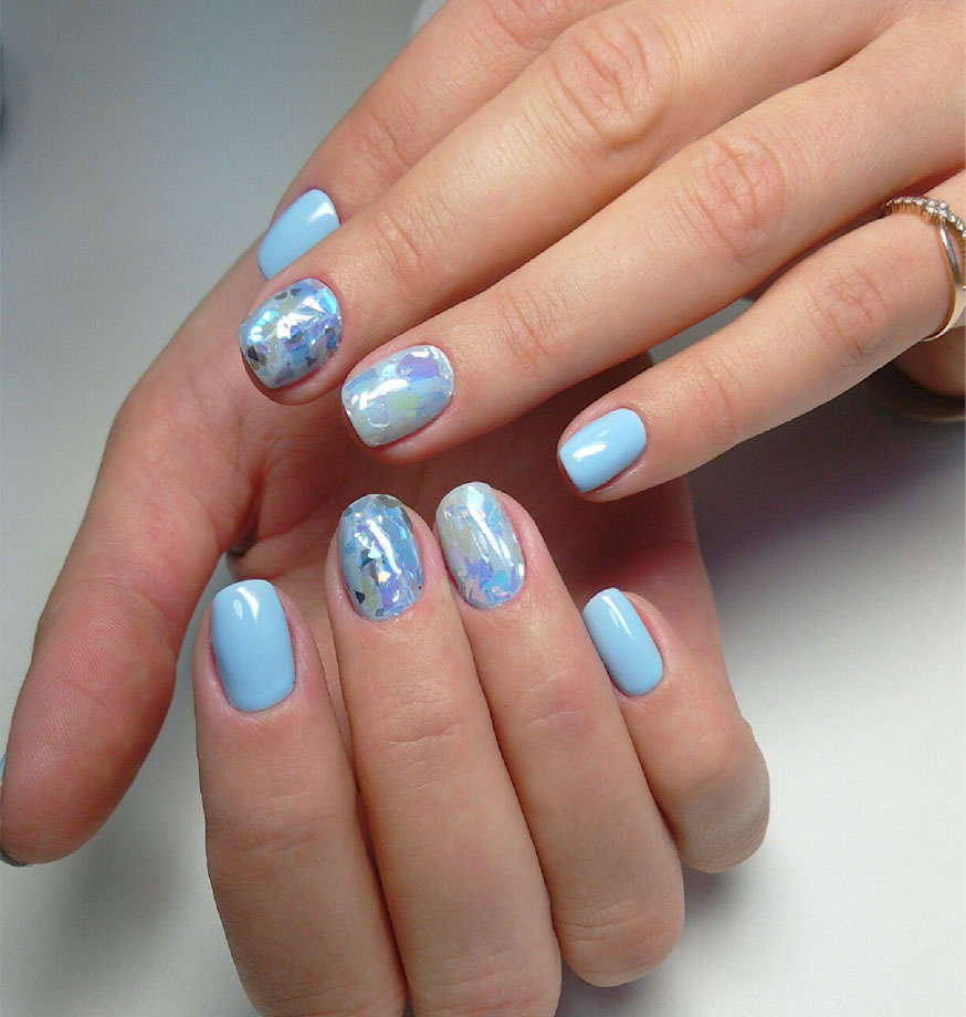 - Design using foil on the accent nail. The combination of pale blue and cream in a classic manicure.