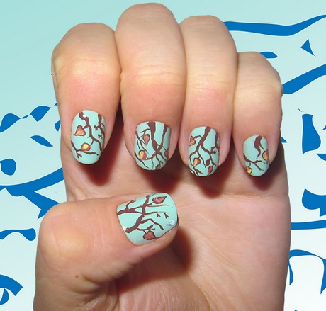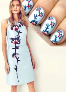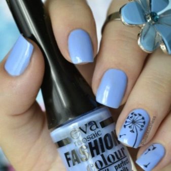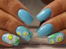 Drawing on a blue background needs careful consideration of the subject. It is important not to disturb color perception. Stylishly look on this basis drawings made in the same color in the sketch technique. In the absence of drawing skills, you can decorate the surface of the nails with strips or regular peas (dots). In vegetable fashion themes. Actual dandelions, ethnic ornaments, branches of plants, leaves, feathers.