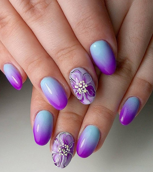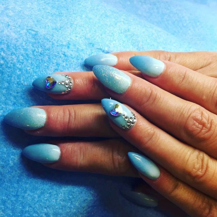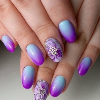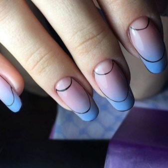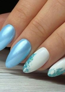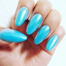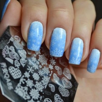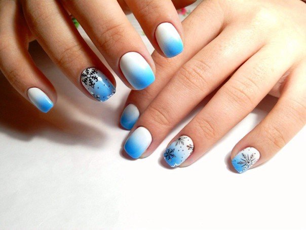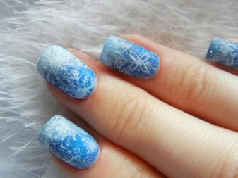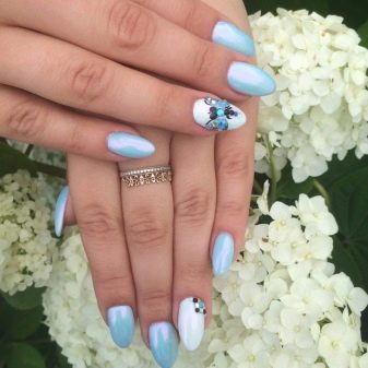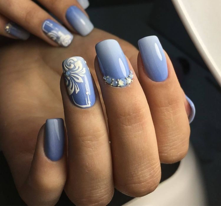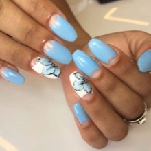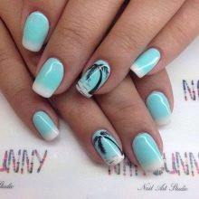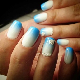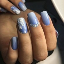 Such design means a gradient design. It is performed using several shades of gel polish, creating a smooth transition from the basic blue tone to the other. The effect of this design is always original and special. In appearance, they are somewhat reminiscent of coatings-chameleons, which are able to radically change the original color during cooling or warming. Often, such a basis is decorated for a specific time of year. For example, it allows you to decorate your nails under the sea or create a snowing effect.