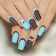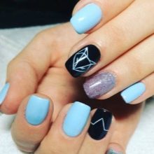 Agree, not always monophonic manicure looks elegant and solemn. Yes, the classics are good for everyday bows, but very quickly it starts to seem boring. In order to somehow accent nails, one has to use contrasts, and with blue one has to be very careful, because he is able to radically change the aesthetic perception, depending on what shade is added to it. Today, fashionable and harmonious combinations of blue can be called combinations with: