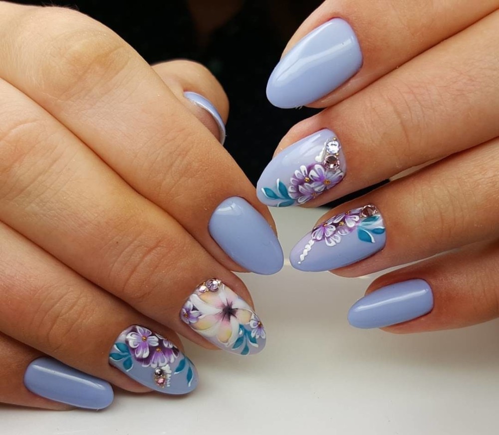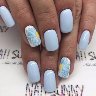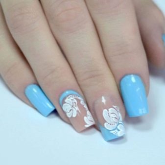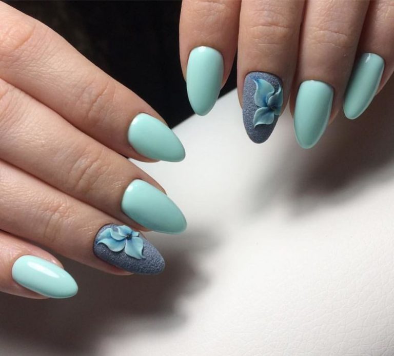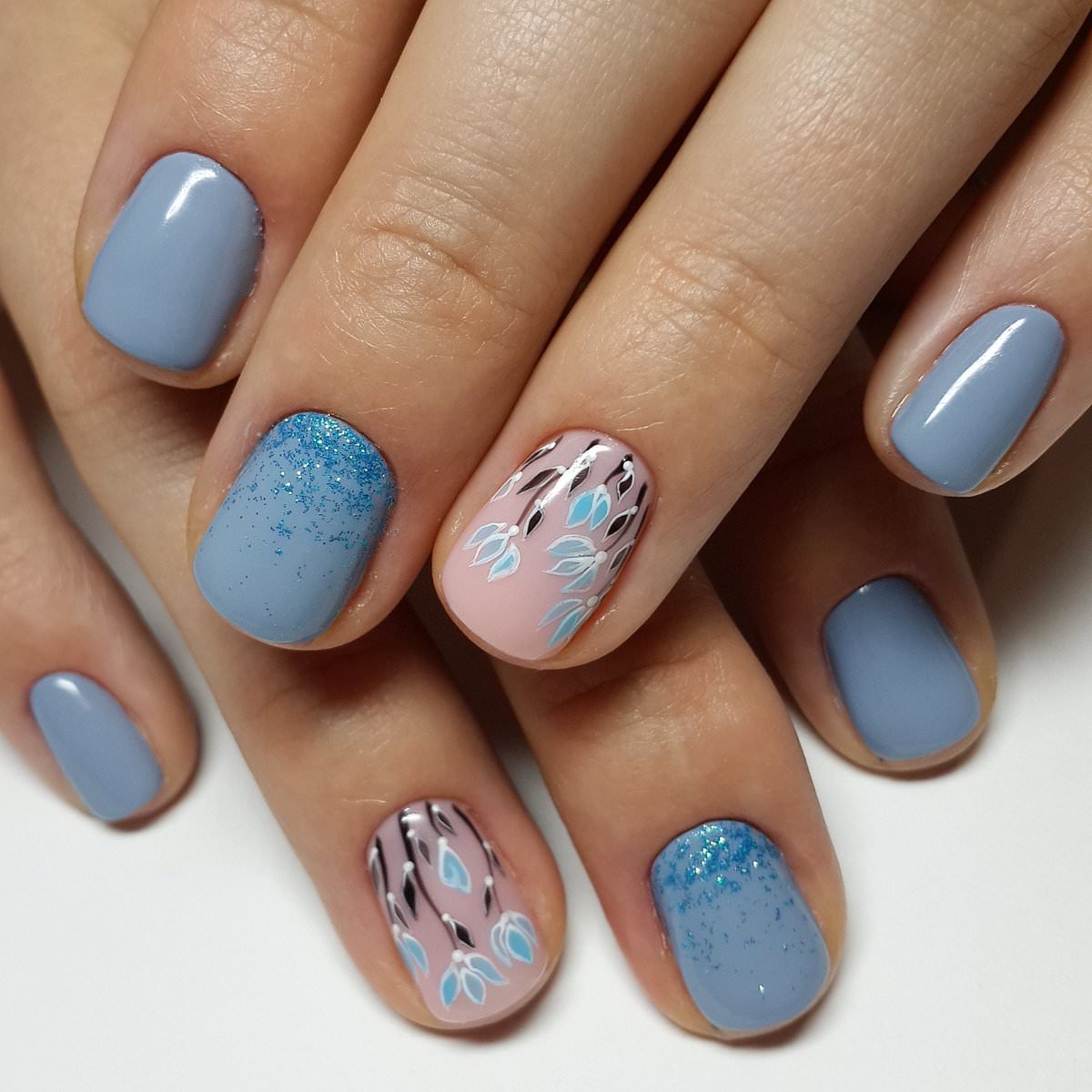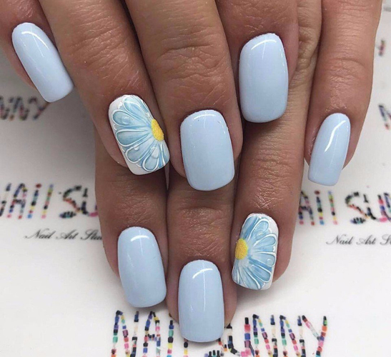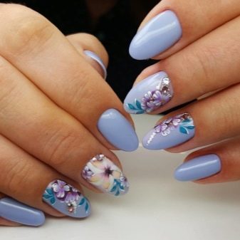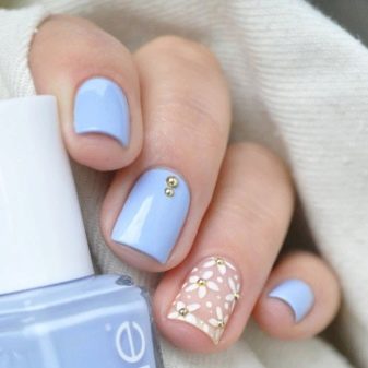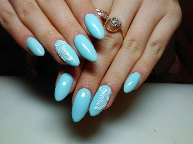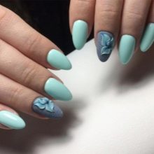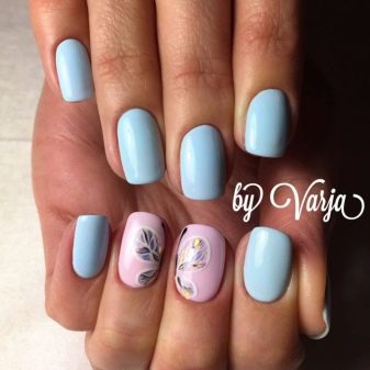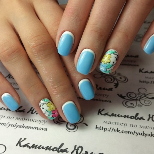 Of course, drawing is one of the best methods of emphasizing the seasonality of manicure. If in the summer, say, you want simplicity and bright colors, this is the case when combining blue with delicate pastel shades of a color palette would be appropriate. Thus, it is possible to decorate the accent nail plates with floral and plant motifs. Made in soft contrasting colors, they will convey a summer mood and harmoniously complete the feminine look. Drawings of falling leaves are good for autumn; volumetric spikes created by acrylic powder.
