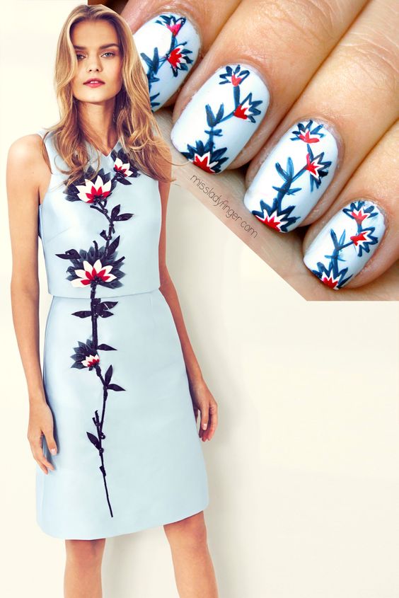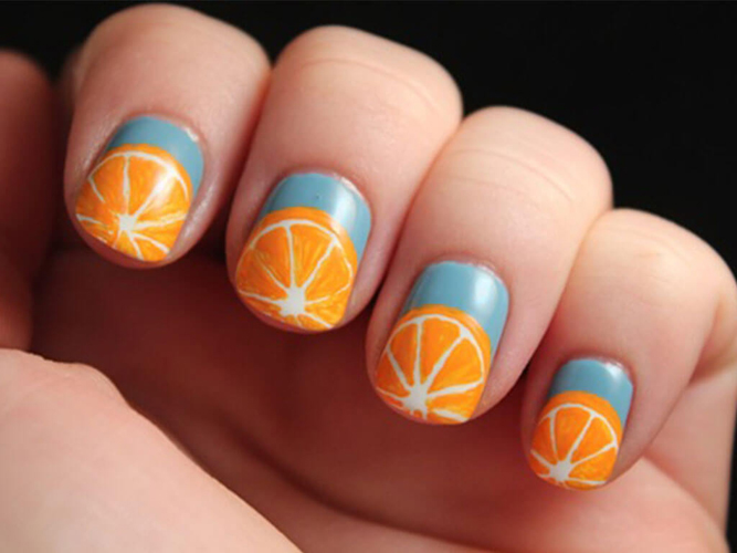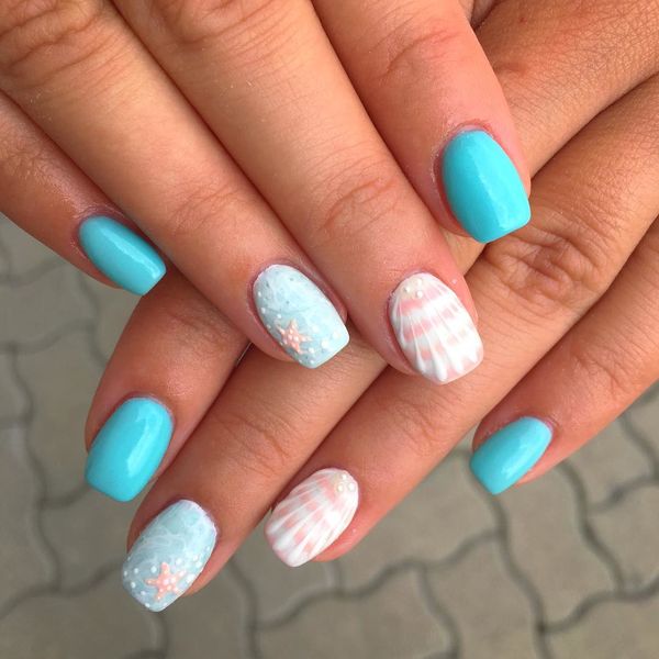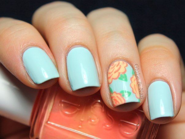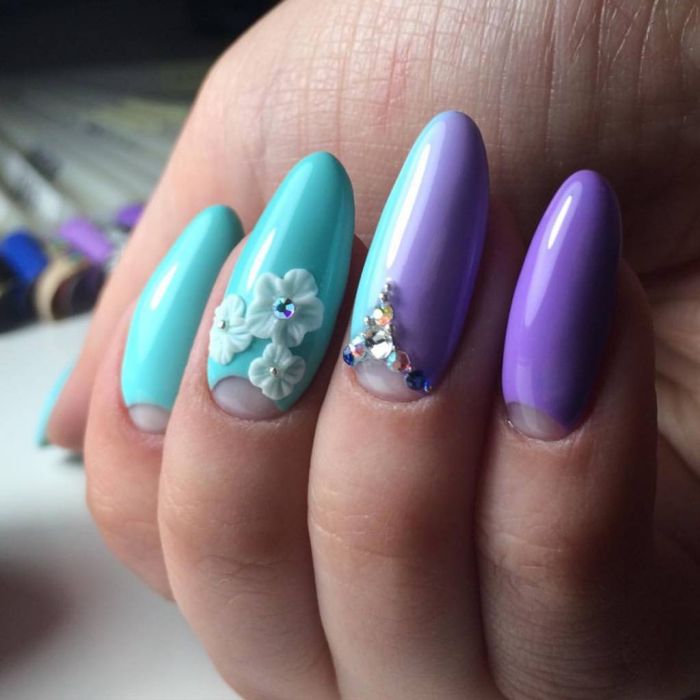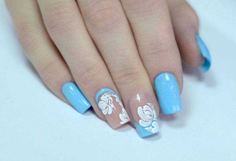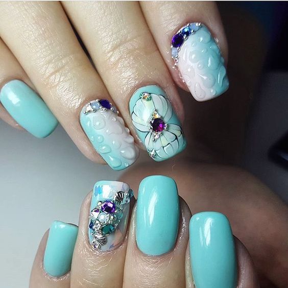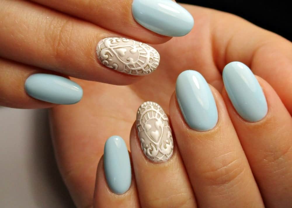 Of course, drawing is one of the best methods of emphasizing the seasonality of manicure. If in the summer, say, you want simplicity and bright colors, this is the case when combining blue with delicate pastel shades of a color palette would be appropriate. Thus, it is possible to decorate the accent nail plates with floral and plant motifs. Made in soft contrasting colors, they will convey a summer mood and harmoniously complete the feminine look. Drawings of falling leaves are good for autumn; volumetric spikes created by acrylic powder.
