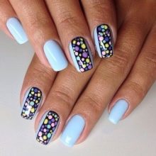 Under this design refers to the emphasis on the bottom hole of the nail plates. Following the current trends, they can be distinguished by the reception of negative space (easier - without painting it at all). Often for such nail design use gel polish of two shades. For example, white or silver contrasts are often added to the blue base. The holes are distinguished not only by color: depending on the design, they are decorated with crystals and rhinestones, they are designated by a pattern or simply by a number of peas in a contrasting tone.