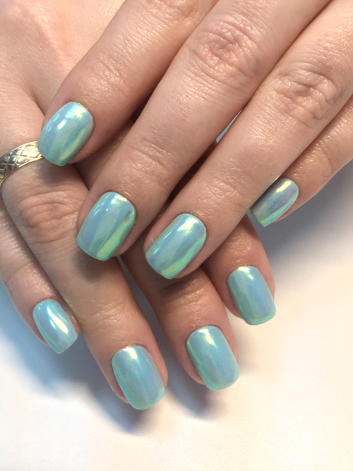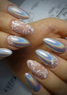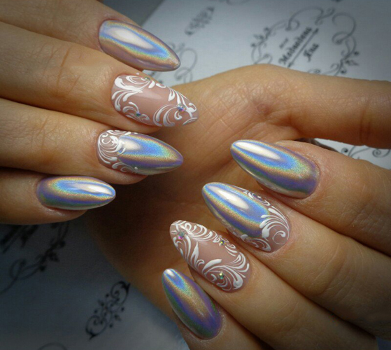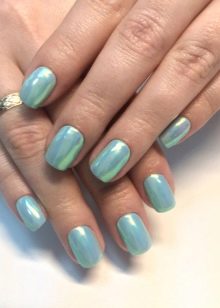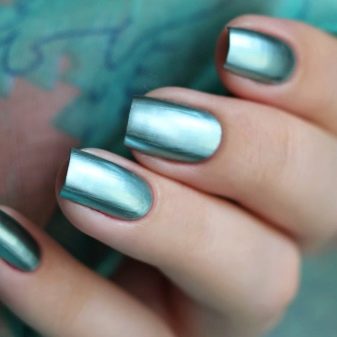 Rubs allows you to create a unique mirror effect. And if it has a special texture, you can make a design with overflow of different tones. Mirror shine on the nails is especially appropriate this season, such pigmentation of the nail plates today is one of the main trends. The coating creates the effect of specular dust, and it can be not only specular, but also chrome, pearl, glass, and also holographic.