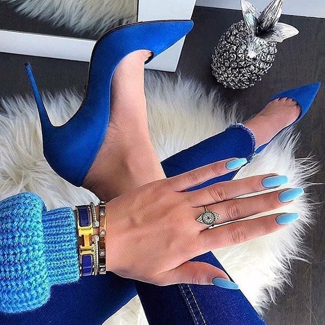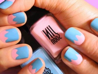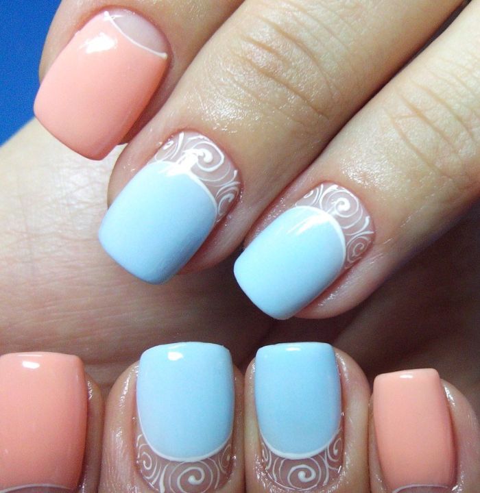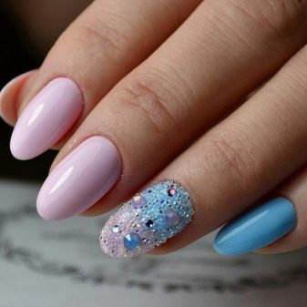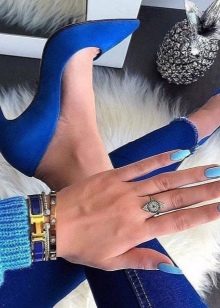 The pink-blue, purple-blue design looks beautiful, but contrasts should be chosen thoroughly, giving preference to soft and muted tones of the color palette. Nothing flashy and vulgar, no acid and poisonous contrasts. The selected tone will depend on the temperature of the blue tint, its intensity and the degree of pigmentation. Light textures are complemented by light tones of contrasting varnishes.