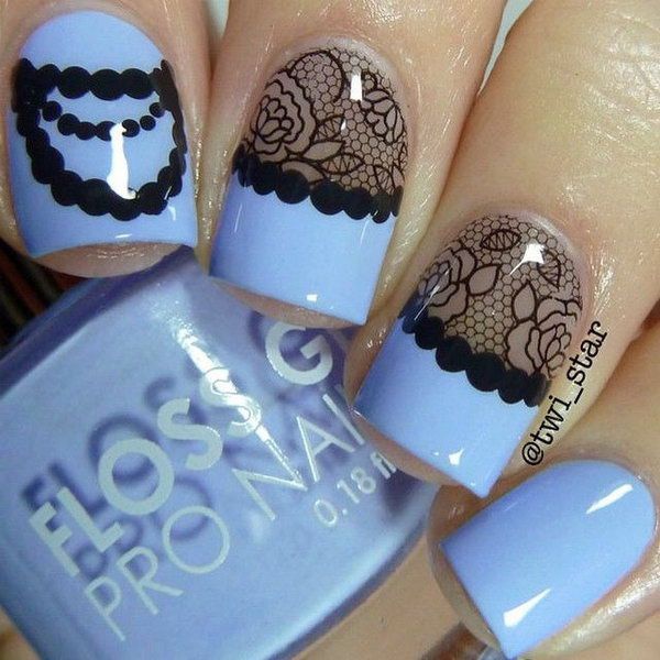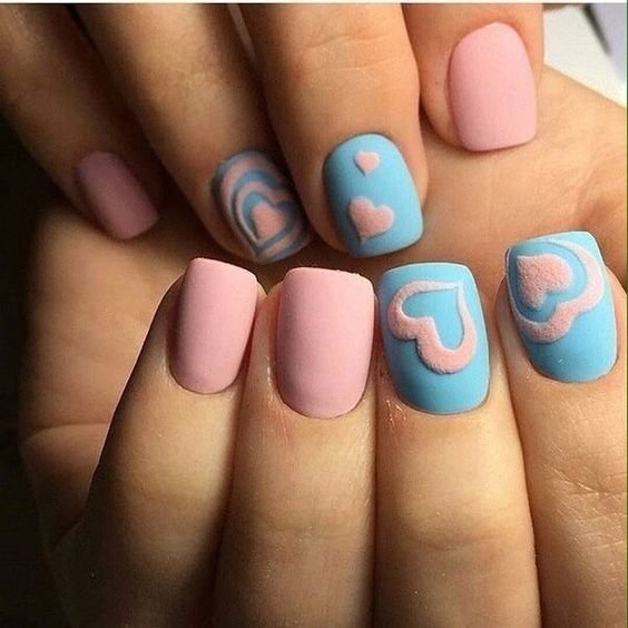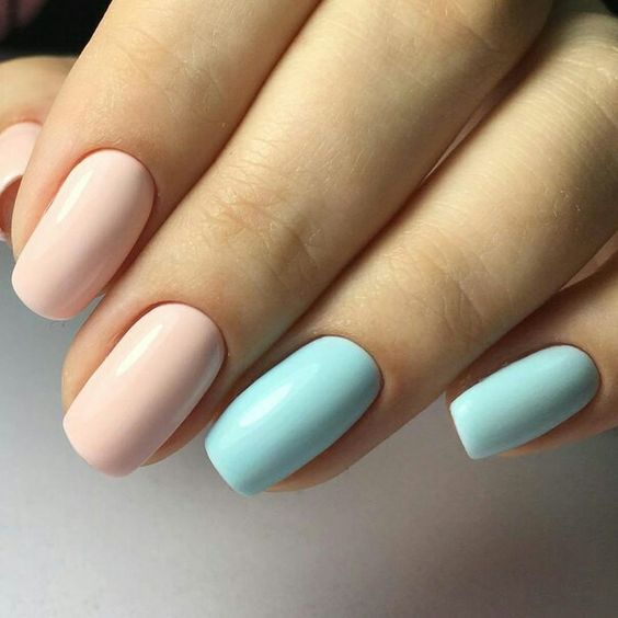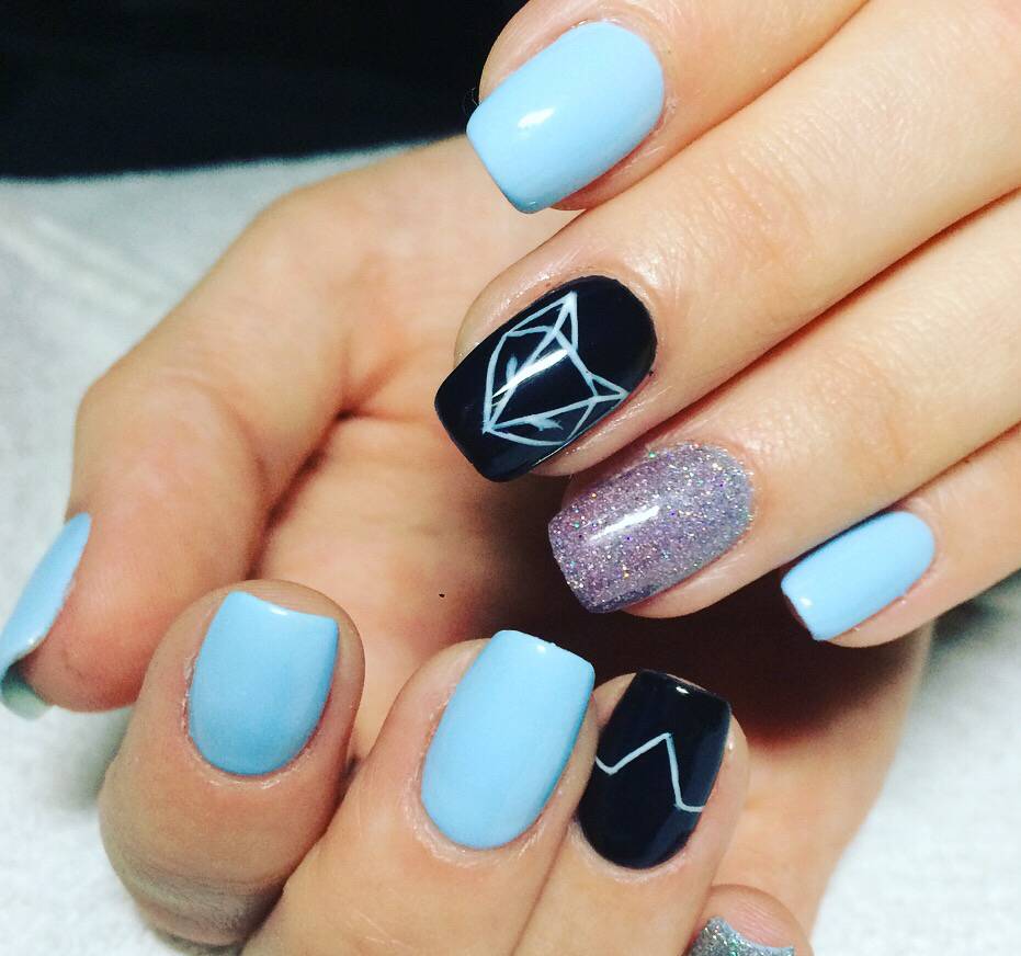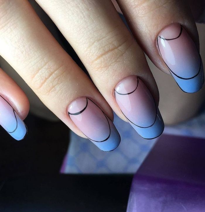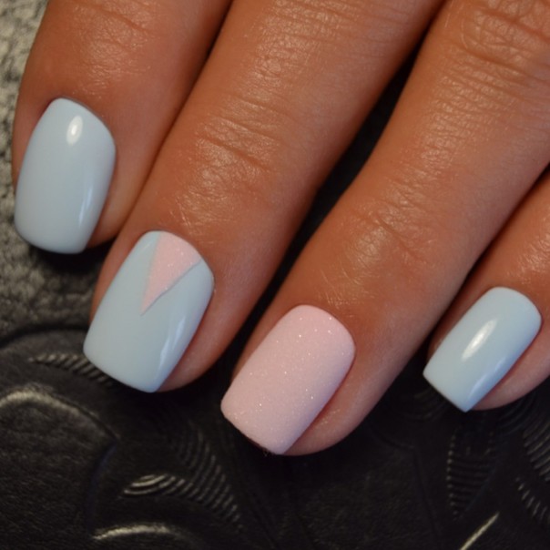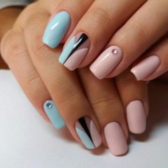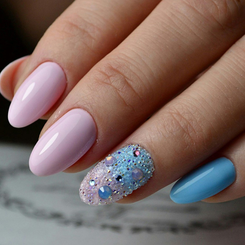 - Unusual solution in the contrast of blue and pink. Use black gel polish for accent nails.