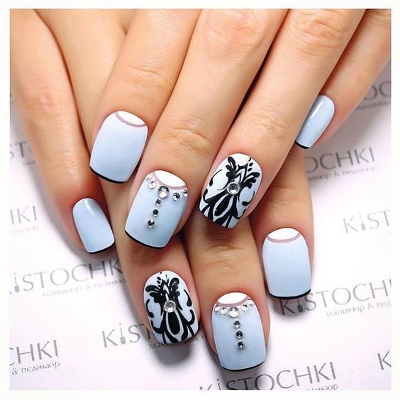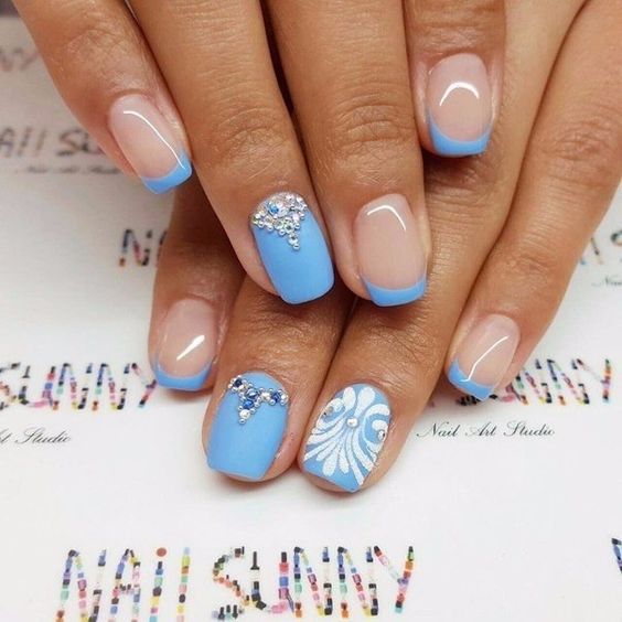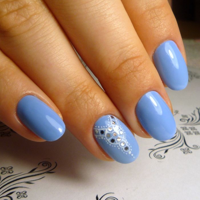 - The classic design option in blue and blue colors looks elegant due to the accent in the form of a picture. The design used several small rhinestones.