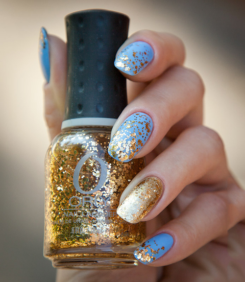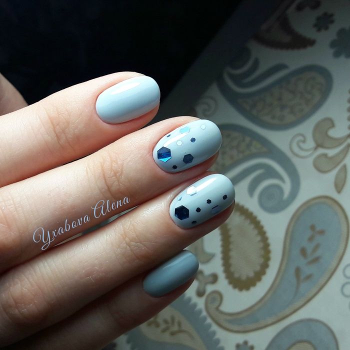 This Japanese decor today is known to almost every fashionistas. He did not lose his popularity and even significantly expanded the form. If earlier they were mostly circles of different sizes, today in the line of kamifubuki you can find all sorts of hearts, triangles, squares, asterisks, rhombuses and even hexagons. However, as for the blue color of the manicure base, here you need to choose related shades and elements of different sizes.