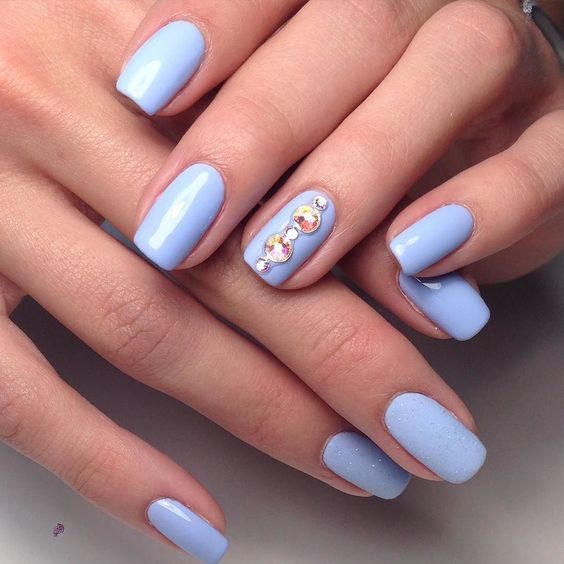 This season, the blue color is represented by a mass of subtle shades. Incredibly popular are the gentle light tones of blue, including sky blue, gray blue, lilac blue, arctic blue, bleached denim and pale blue tones. Gentle colors are great for different women's bows, personifying the lightness and sophistication of the image. They look quite noble, even if it is a concise classic nail design.