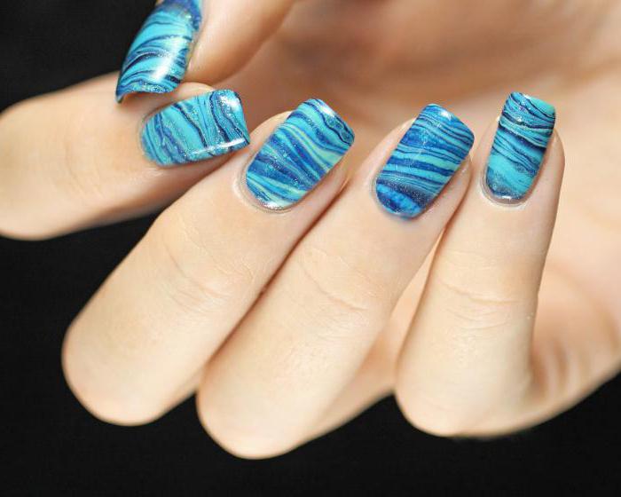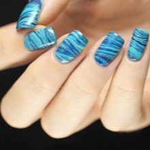 Blue-blue manicure in the summer version can be called a blue. This shade looks great with metallic, gloss and sparkles. A white abstract or slightly uneven pattern on top of such a background will also look lively and directly.