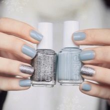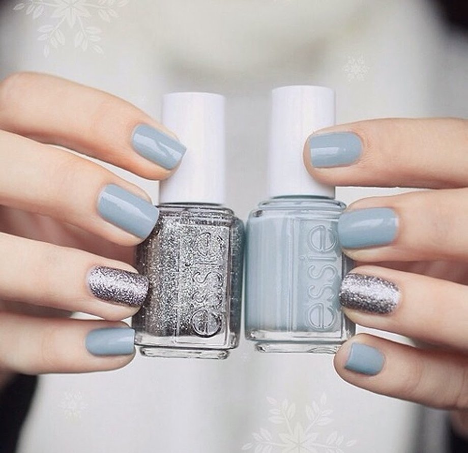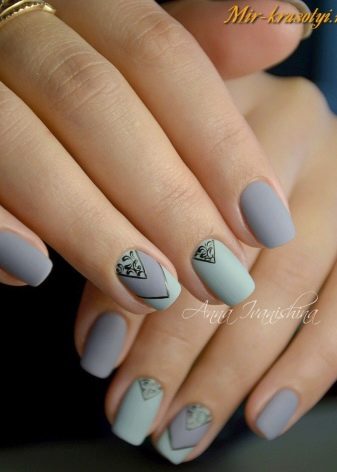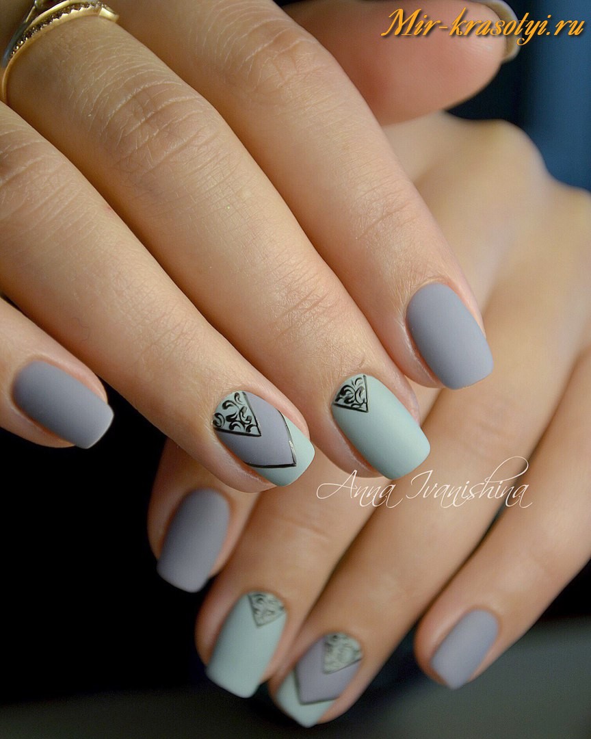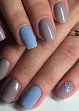 Gray-blue decor option is more often used in winter, as from these colors winter motifs of snowflakes or frost on nails are well obtained. Matte or matte-glossy coating will perfectly fit here.