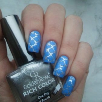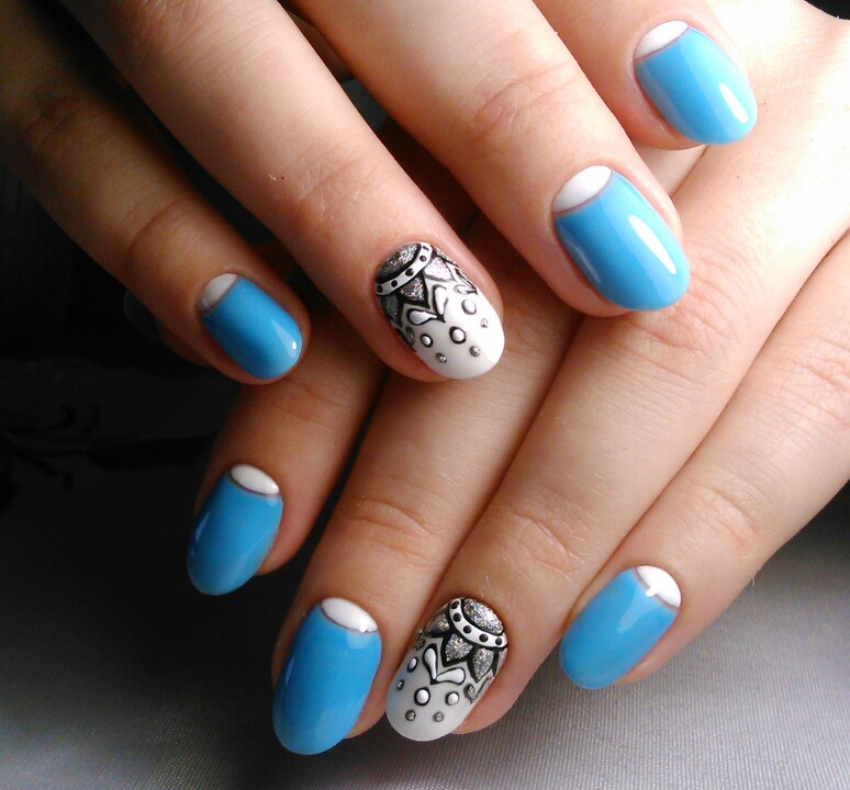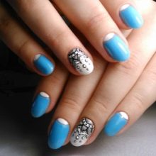Whatever the chosen style, in creating a blue manicure has its own characteristics. Gentle blue tone is a convenient base for creativity. The most appropriate shades for this are pale blue and milky white (with a slight blue tint) color. They are much more convenient and easier to dilute with dark blue saturated tones or other colors.