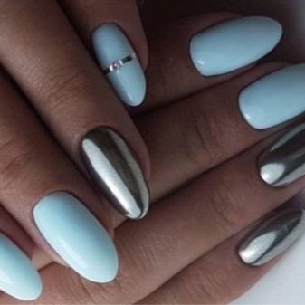 Using a mirror rubbing gives your nails an unusual shimmer that looks very impressive on a cold blue tone. After applying the composition to the gel varnish, for greater effect, it is recommended to apply a glossy top. This coating can be used not only on all fingers, but also on one, while receiving a striking accent. This technique gives a certain zest to the whole image.